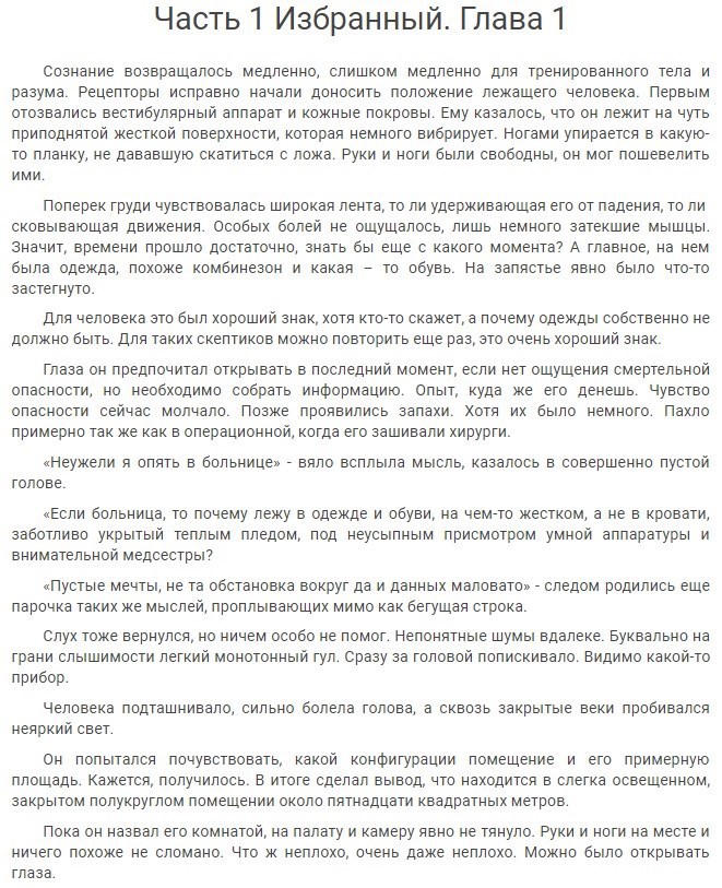 Глава 1. Первый абзац, как описание какого-то механизма: рецепторы исправно начали доносить... первым отозвались вестибулярный аппарат и кожные покровы...