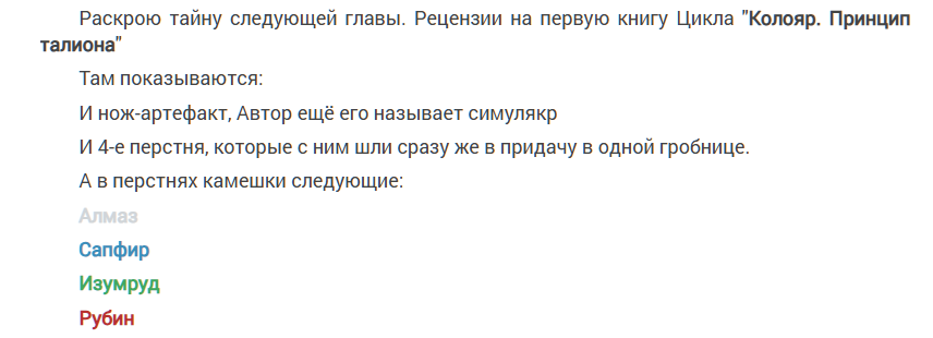 В цикле рецензий же есть четкая структура и подведение автором доказательной базы под свои теории. Все и вправду начинается с обзора сюжета, из которого KiTa логично переходит к анализу элементов истории — в частности ножа-артефакта и драгоценных камней, которые фигурируют в романе