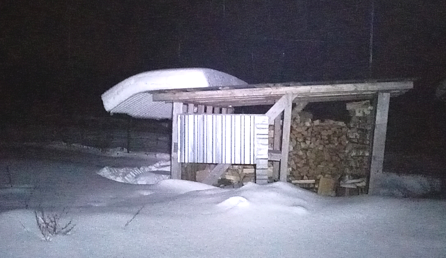 А это - дровник с поехавшим снегом. Сильные ветра не позволяли снегу скапливаться особо большим слоем. Днем было +2, часть снега успела скатиться, вечером стало холодать, снимал уже при -20.