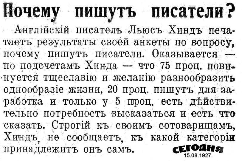 Автор: brombenzolПочти сто лет назад (летом 1927 года) в рижской эмигрантской газете "Сегодня" (не признавшей языковую реформу русского языка) появилась любопытная заметка "Почему пишут писатели?".