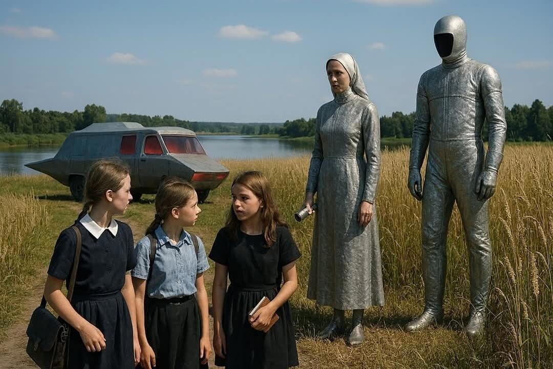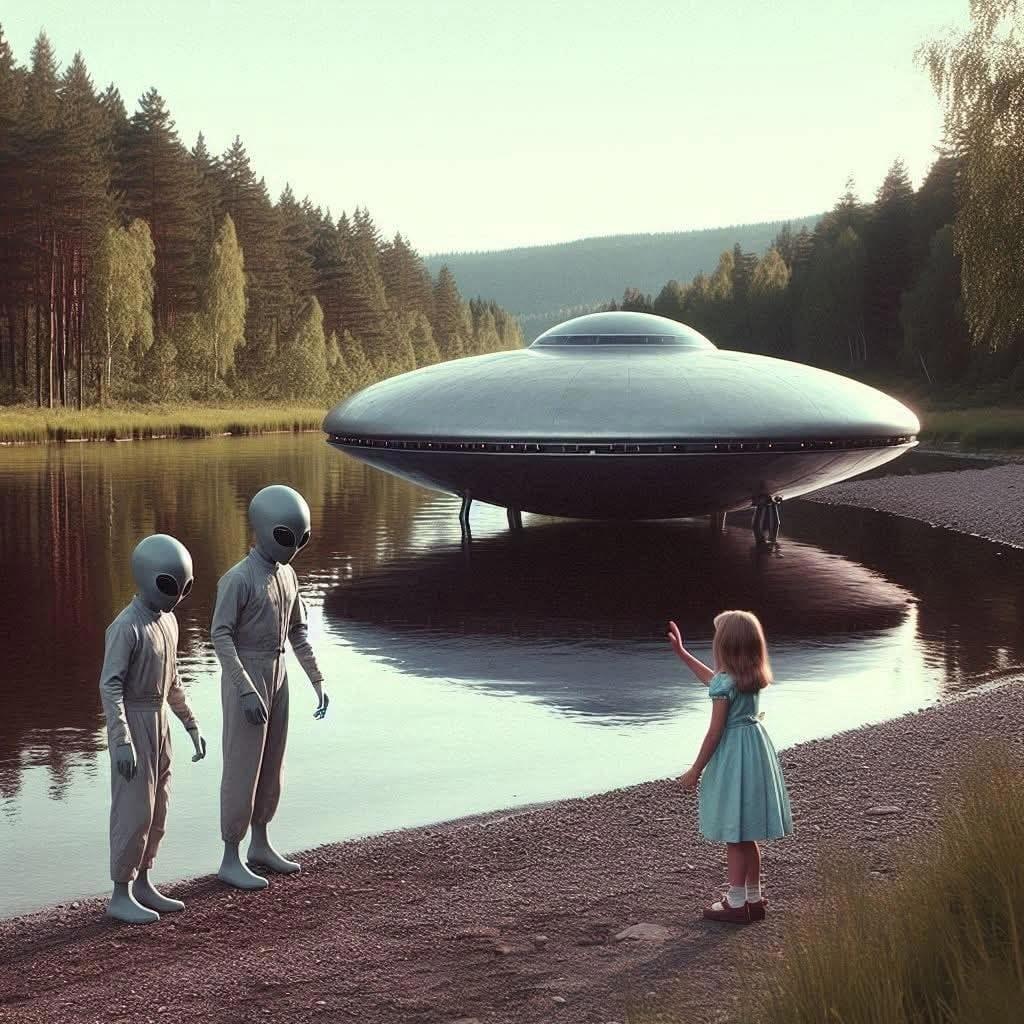 Разумеется, она не понимала, что это такое. Открылся люк, и сначала ей показалось, что из аппарата выходят люди, но затем она увидела, что это не люди. Существа были примерно одного роста с девочкой. Они были бледными, с большими тёмными глазами, маленьким скрюченным ртом и едва заметным носом. Несмотря на это, девочка не испытывала страха.