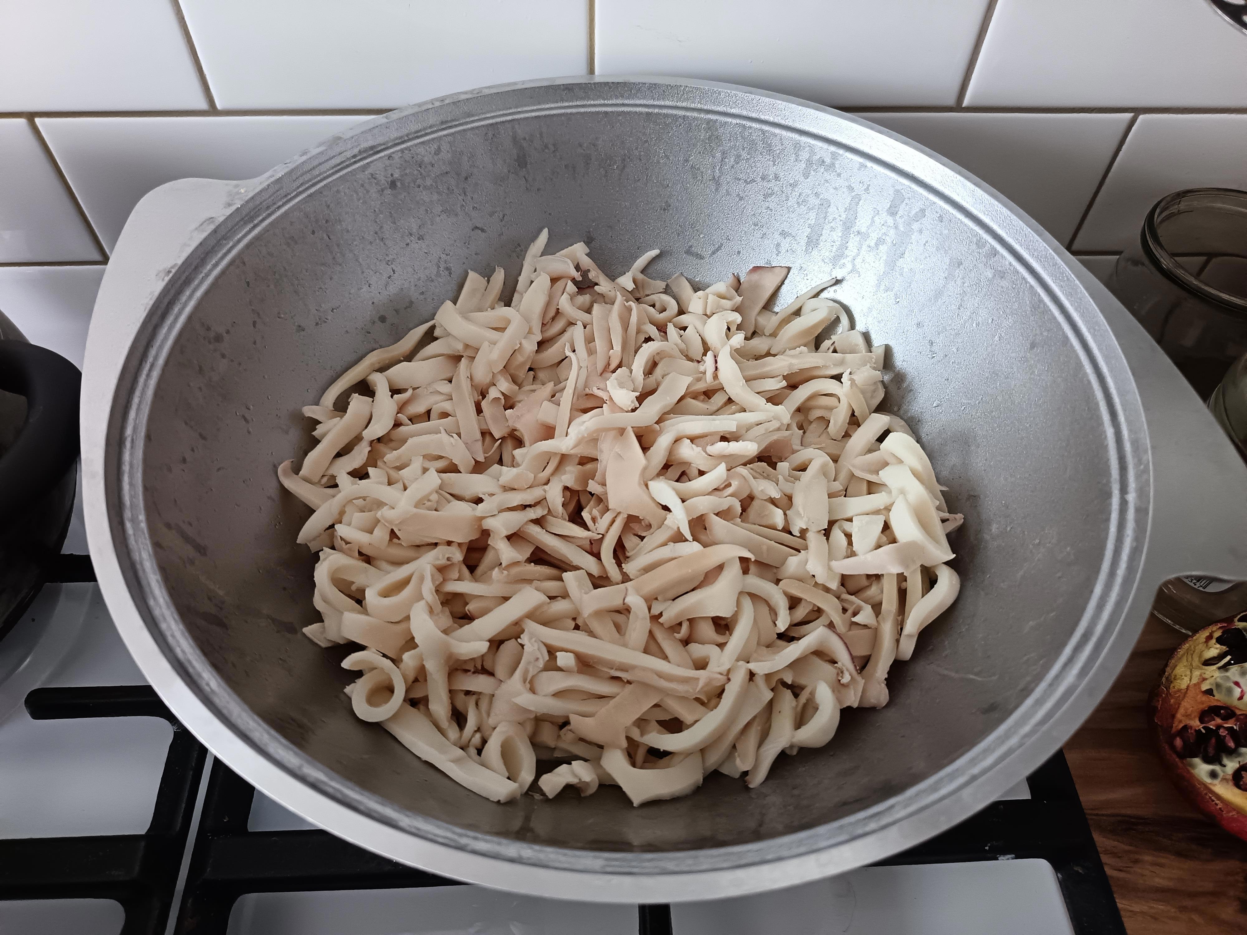Далее, к уже чуть обжарившимся кальмарам я добавил грибы. Использовал вешенки, я их разрезал вдоль волокон (не очень мелко, чтобы грибы свой вкус не потеряли) и замочил в воде, пока все остальное нарезал и подгатавливал. Вот момент закладки в казан - кальмары подальше от нас, вешенки на переднем плане.