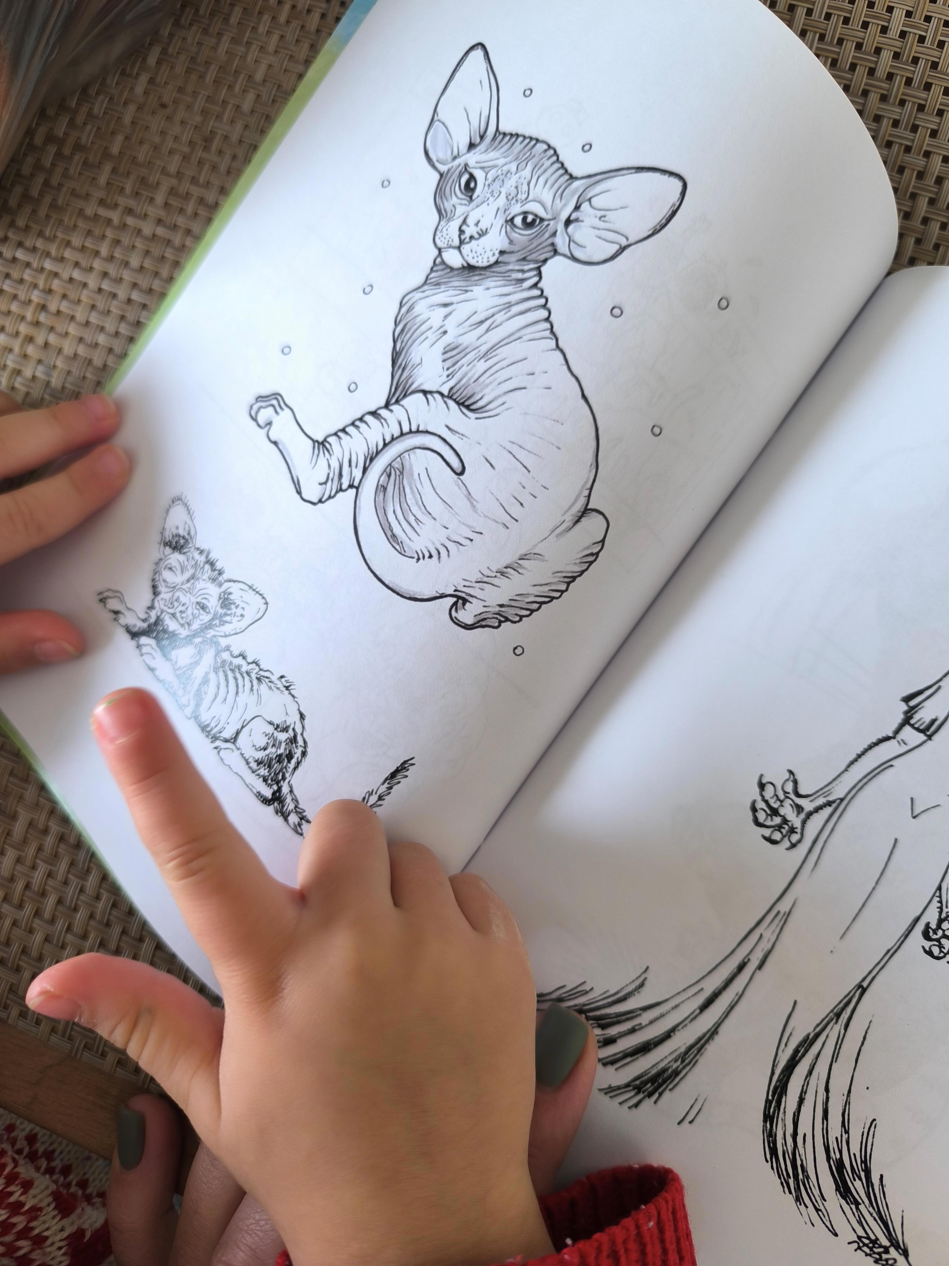 А тут дочь в восторге от разнообразия котов :D Артбуки сразу отошли ей. Вот тут она мне объясняет, что малышу хорошо и тепло, например: