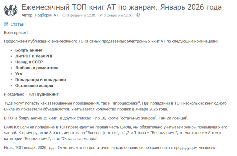 Это то самое исключение. Официальная информация о самых продаваемых книгах за месяц. Удивителен тот факт, что администрация НИГДЕ в более менее раскрученных официальных источниках не указывает и не рекламирует данную статистику. А информация о ее существовании передается шепотом и по секрету от одного пользователя другому. Хотя, как мне кажется, это весьма любопытные данные, которые могут отчасти послужить неким источником выбора "Что почитать" для читателей. И где бы вы думали следует искать эту инфу? В блоге аккаунта "Подборки АТ". Так то! А можно было бы, например, создать еще одну вкладку в разделе Сообщество/ТОП/Рейтинг продаж книг в шапке сайта.