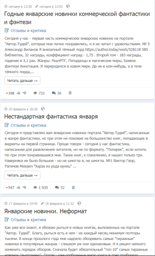 Здесь предлагаю вниманию посты от интересного Автора Вадима Нестерова, который вот уже несколько месяцев обозревает разного рода ежемесячные ТОПЫ, сформированные по объективным критериям, но приправленные субъективным мнением Автора. И эта комбинация выглядит весьма интересной. Да и в сами топы часто залетают совсем неочевидные, но достойные книги. Зацените три последних поста!
