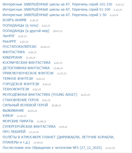 Ну и напоследок всем, кто ищет себе интересные книги для чтения, у меня есть подборка Законченных качественных циклов на АТ, в которой мной отобрано уже около 150 серий. А к ней прилагается уникальный классификатор по жанрам и направлениям. Обязательно подпишитесь на упомянутых выше Авторов и мою подборку, чтобы не пропустить интересное чтение.
