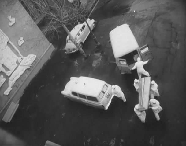 Милиция оперативно перекрывает улицы. Машина «скорой» везёт гроб, по виду – цинковый, что ещё больше нагнетает остроту ситуации. Вокруг гроба – эскорт из людей в тех же противоэпидемических костюмах. Спецмашина возглавляет короткую колонну из трёх машин – «буханки» и ещё одного «универсала».