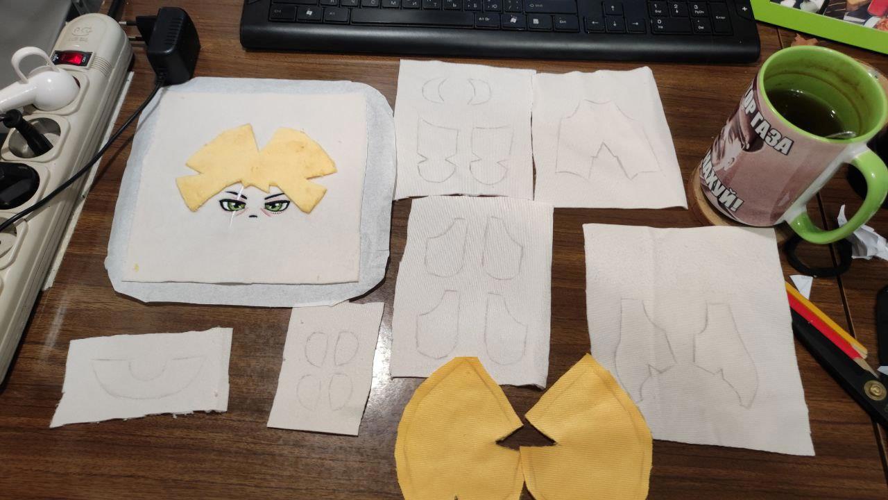 Начала шить с Тоши, потому что ему по традиции должны перепадать все шишки. Раскроила детальки тела, прически и мордочки.