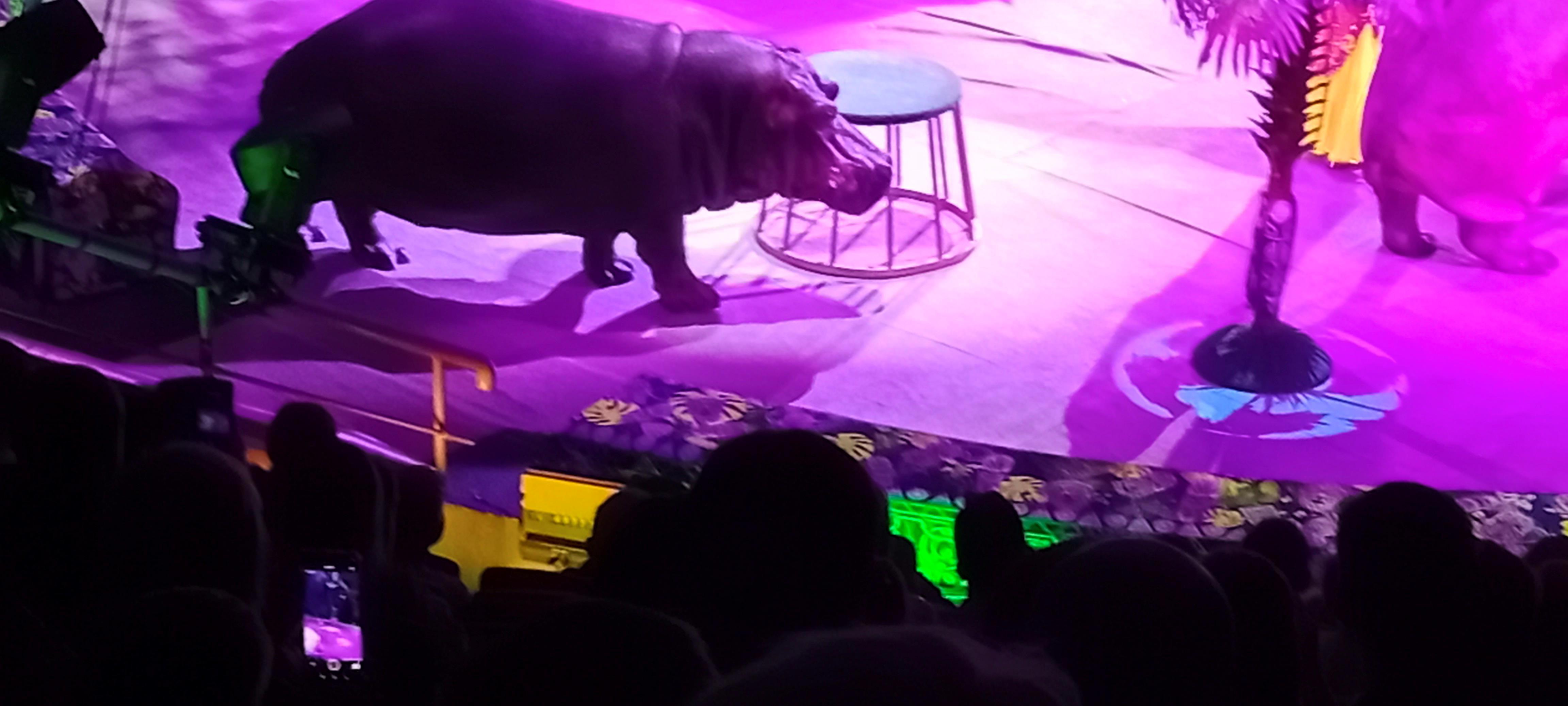 Первый (по счету, но не по важности)— бегемоты. Их было три, и они ничего особенного не делали: просто себя демонстрировали — ходили по арене, сидели на постаментах. Но бегемоту ничего больше показывать и не надо, он же бегемот. Само появление его — готовый аттракцион.