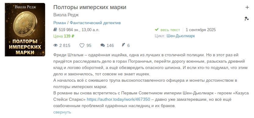 Вот ещё занятный пример описания книги. Вроде обложка и аннотация ни на что такое не намекает. Ну детектив, как детектив. Разве что, не ясно будет ли ищейка в прямом или переносном смысле. Но вот если нажать на "показать всё" под аннотацией (тут нажато), то внезапно вылезает абзац про первого советника и свадебки...