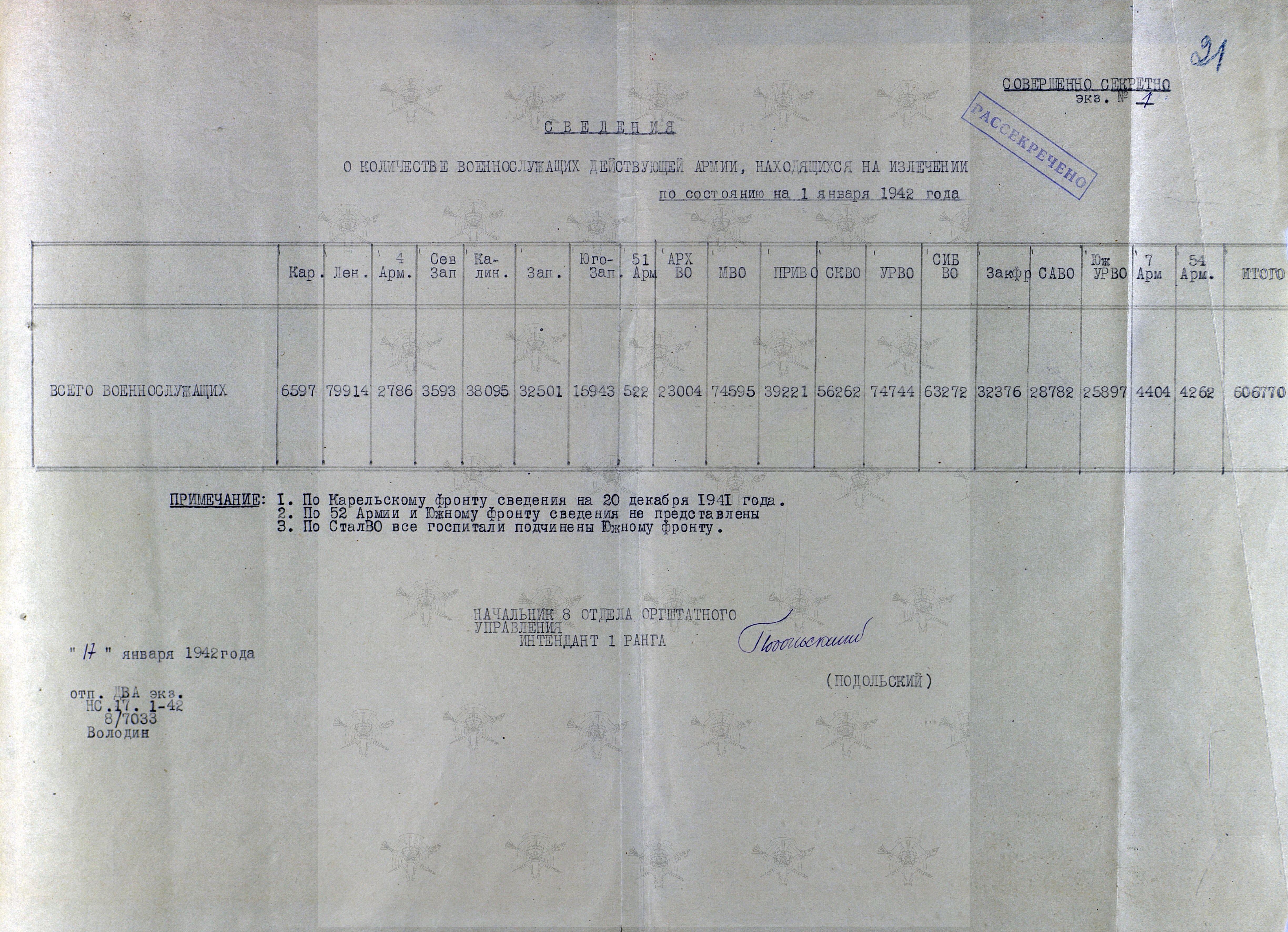 Вывод о том, что даже на стол И.В. Сталину могли лечь не полные данные можно сделать по сведениям, представленным ГВСУ по состоянию на 1 января 1942 г. Как видите, сведения по Карельскому фронту – устаревшие, а по 52 Армии и Южному фронту вообще не представлены.
