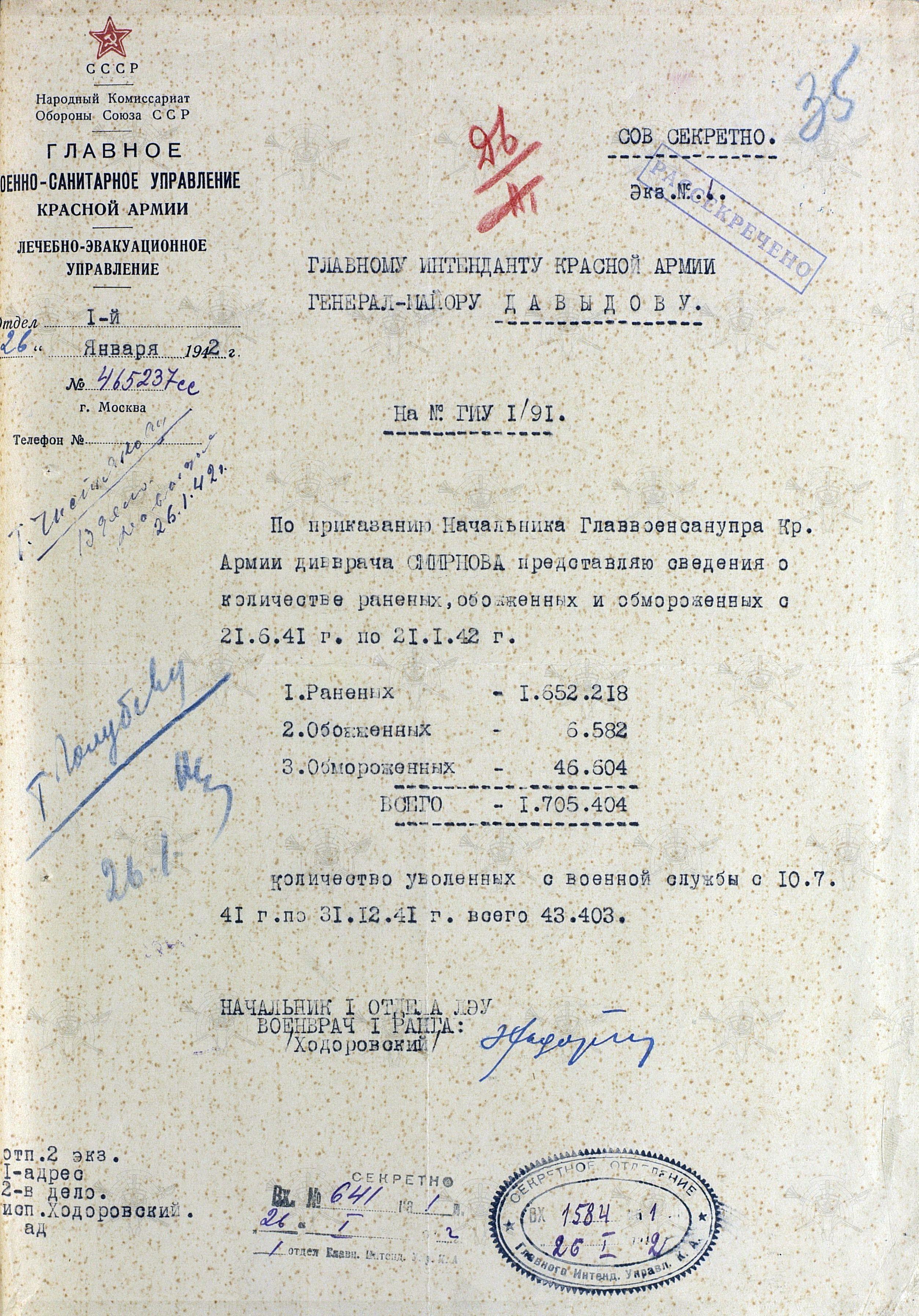 Итак, по сведениям Главного военно-санитарного Управления Красной Армии, за указанный период, общее количество санитарных потерь составило 1 миллион 705 тысяч человек. Если сравнить с ноябрьскими данными, выходит, что за 2,5 месяца количество ранбольных увеличилось на 685 тысяч человек. Да, увеличение значительное, но ни о какой разнице в разы, а тем более на порядок речь не идёт. Скорее это похоже на то, что в своём докладе использовал данные, представленные по линии ГВСУ, возможно, что и не полные.