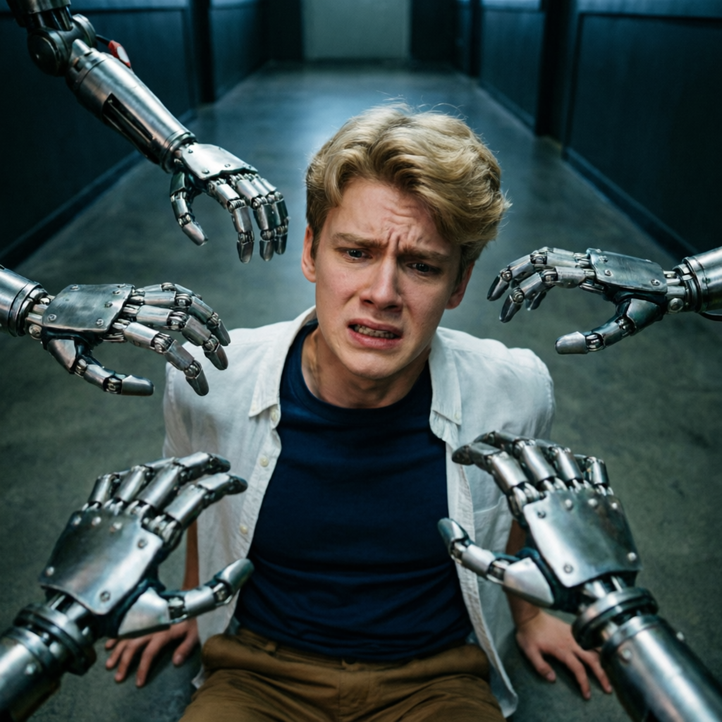 Он – один против пятерых, без возможности хорошо видеть, с кипящей головной болью, чуть ли не в темноте. Из оружия у Мервина в кармане оставалась лишь отвёртка. Да, он её улучшил, превратив её в техническое универсальное устройство, которое может выкручивать саморезы разных размеров и видов. Но против оживших роботов, способных прикончить Мервина в любой момент, - сверх возможного. Чувство безвыходности так и давило и нагревало тело парня, что аж капля горячего пота стекала по виску. Мервин пытался сдерживать себя и не паниковать.