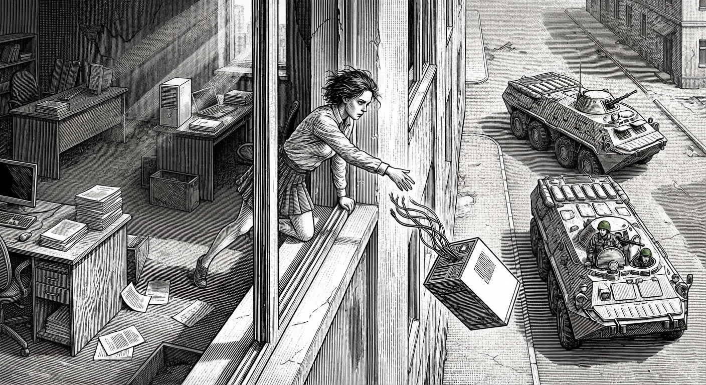10. Женька во время боя за склад. Да, с проломленной крышей ИИ, конечно, малость погорячился. Но он вообще натура увлекающаяся.