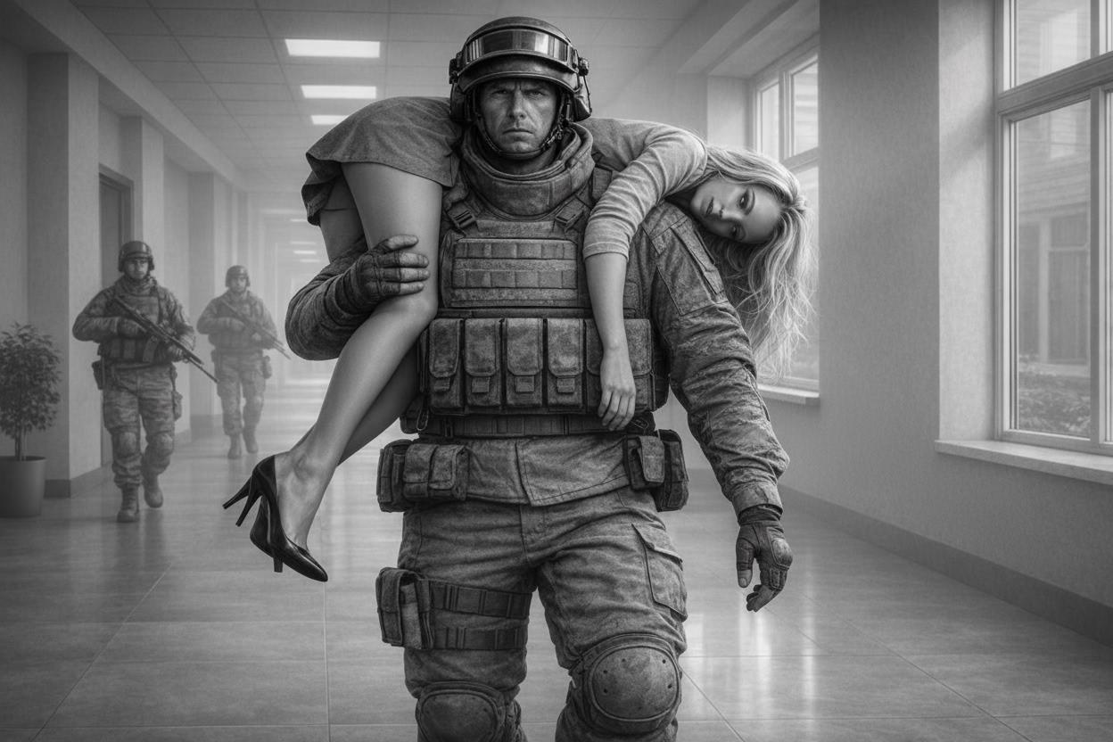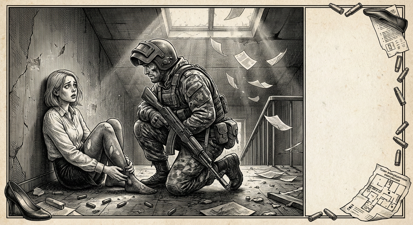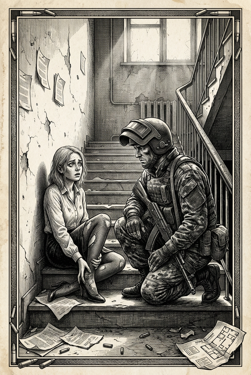 2-3. Женьку выводят из бизнес-центра, но она как-то не вовремя решила подвернуть ногу... Чего это вдруг ИИ потянуло вот в такой стиль оформления иллюстраций - мы с Димой без понятия, но я решил не обрезать, а оставить, как было.