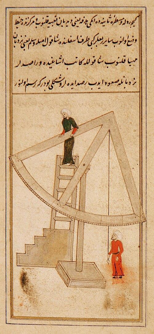 Здесь мы видим квадрант на иллюстрации в турецкой книге. У этого квадранта есть две важные особенности, - он мобильный (то бишь, переносной) и он имеет огромные размеры. Радиус квадранта где-то в два с половиной раза больше человеческого роста.