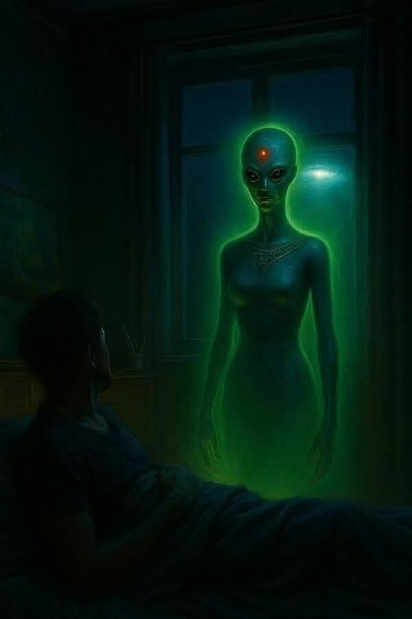 Гуманоидная женщина имела полностью безволосую, лысую, овально-образную голову. На ней был облегающий костюм сине-сероватого цвета, примерно совпадающего по оттенку с цветом её кожи. Костюм имел украшенный воротник, своего рода декольте. На лбу у инопланетянки находился, по-видимому, красный рубиновидный объект или камень, который излучал слабый свет (вроде третьего глаза?). Мужчина мог увидеть её грудь и длинные руки. Всё её тело было окутано зеленоватым светом, подобным сиянию или ауре.
