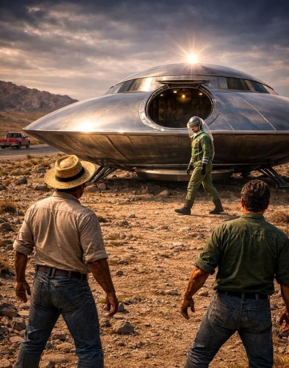Выйдя из машины, чтобы проверить неисправность, Адольфо заметил серебристое отражение на равнине, недалеко от дороги. Приблизившись, они поняли, что это нечто неизвестное: перед ними находился большой дискообразный объект, покоящийся прямо на равнине рядом с шоссе.