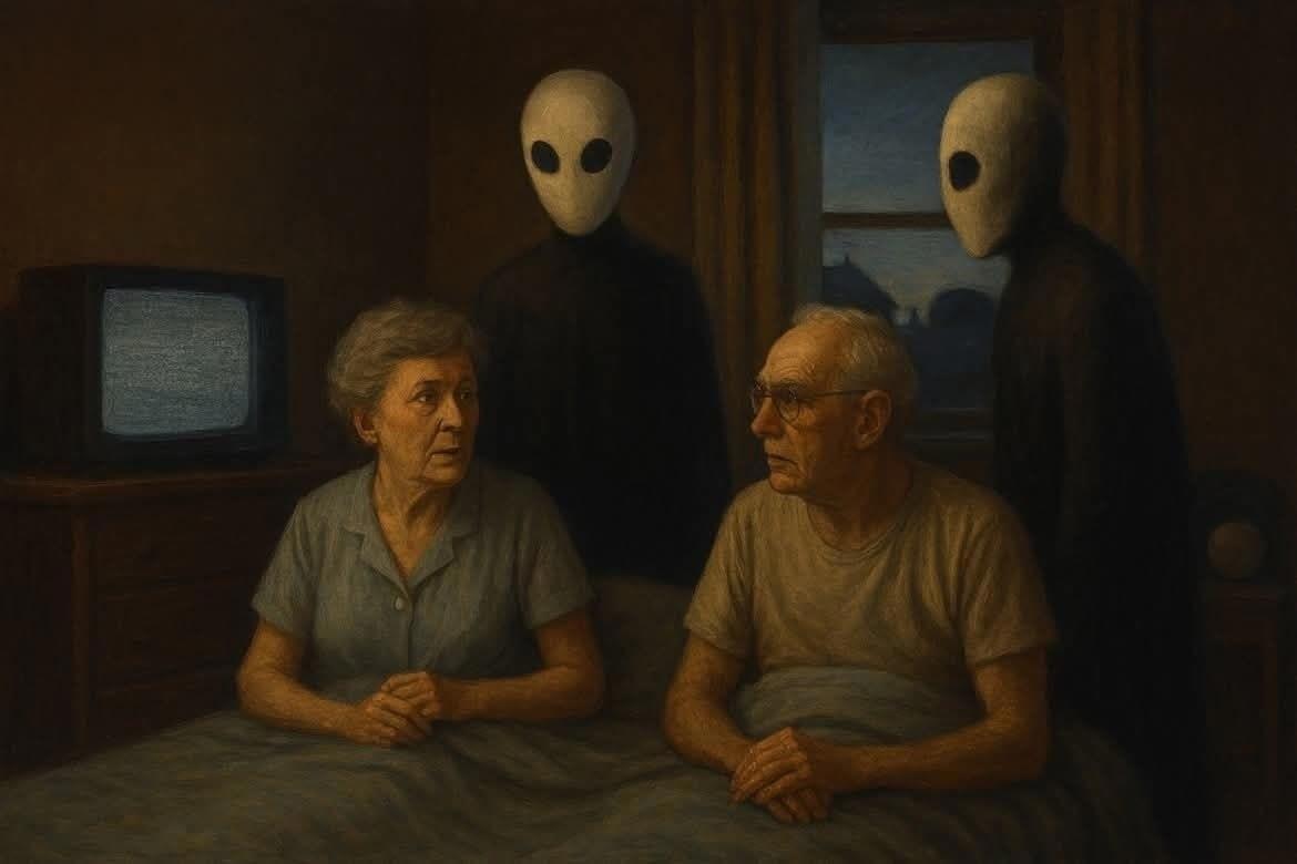 Мистер и миссис Г. легли спать около 17:00 и задремали, смотря телевизор. Позднее миссис Г. проснулась в оцепенении и обнаружила, что в телевизионном приёме появились помехи, изображение дрожало и исчезало на короткие периоды. Внезапно и звук, и изображение исчезли, экран стал чёрным. Вдруг миссис Г. заметила двух существ, стоящих в комнате очень близко к ней, и она сразу разбудила мужа, который также увидел существ в комнате. Эти два существа затем подошли к кровати: одно село на край, очень близко к миссис Г., другое село на таком же расстоянии от мистера Г. Они описали существ как похожих между собой, около 1,60 м ростом, с белыми лицами. Странно, но хотя наблюдатели находились очень близко к существам, они могли различить только их контуры, детали вроде рта, глаз или ушей видны не были. По словам миссис Г., существо, сидевшее ближе к ней, затем установило с ней телепатическую связь и спросило её: «Вы нужны для воспроизводства человеческих существ?» Она также считает, что её спросили, хочет ли она пойти с ними. После неопределённого промежутка времени незнакомцы внезапно исчезли.