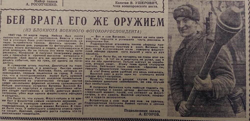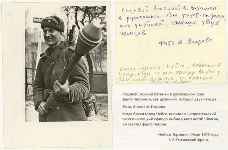 Василий Василиевич в бою за вражеские окопы вступил в рукопашную схватку, офицер врага выбил у него из рук автомат ППШ, ногой. Ватаман не растерялся, подхватил незаряженный панцерфауст (возможно, выстреленный, пустой, это труба длиной около метра), и оглушил сперва этого офицера, затем немецкого же солдата.