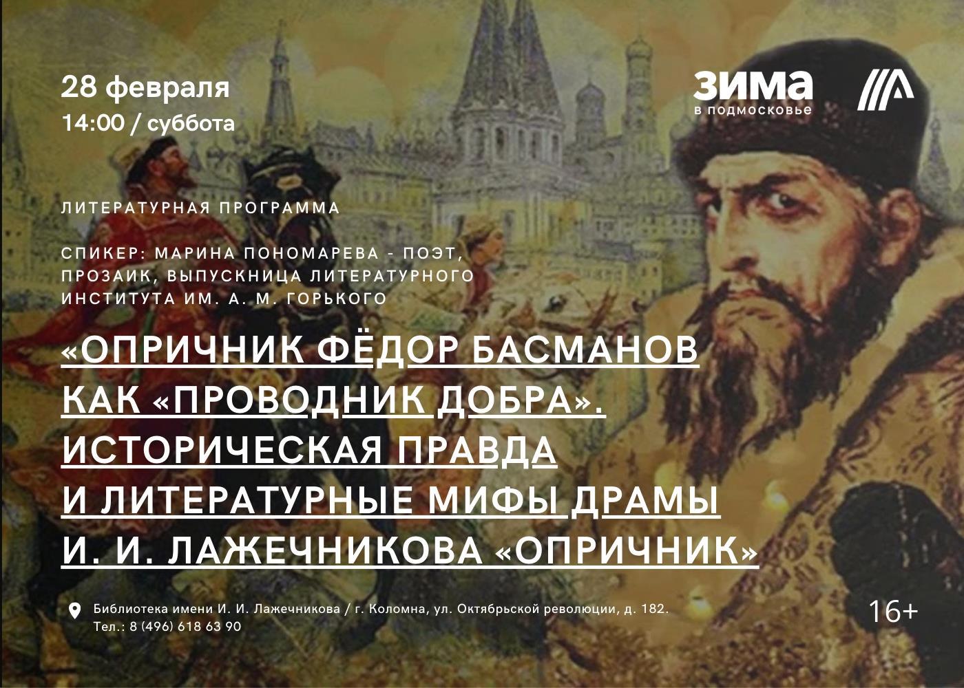 В эту субботу 28 февраля (ага, в последний день этой зимы!) снова выступаю в Коломне, и снова в старейшей библиотеке Подмосковья – библиотеке им. И.И.Лажечникова с лекцией "Опричник Фёдор Басманов как "проводник добра". Историческая правда и литературные мифы драмы И.И.Лажечникова "Опричник"