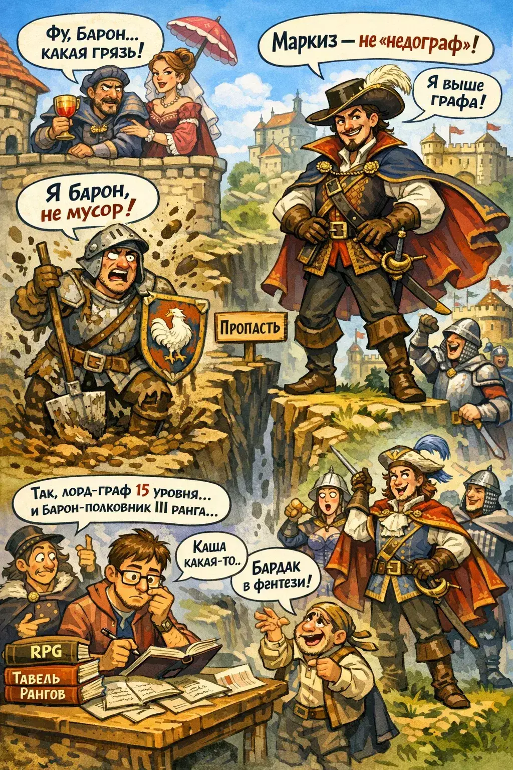 В нашем фэнтези часто смешивают петровскую "Табель о рангах" (где важна выслуга) и западный феодализм (где важна земля). В итоге получается странный гибрид: титул вроде западный, а ведут себя герои как чиновники в министерстве.