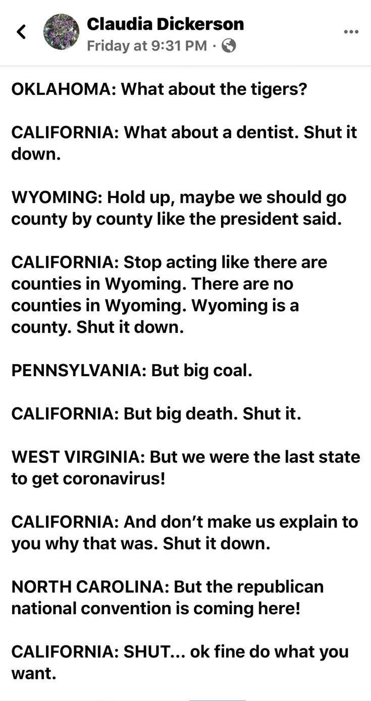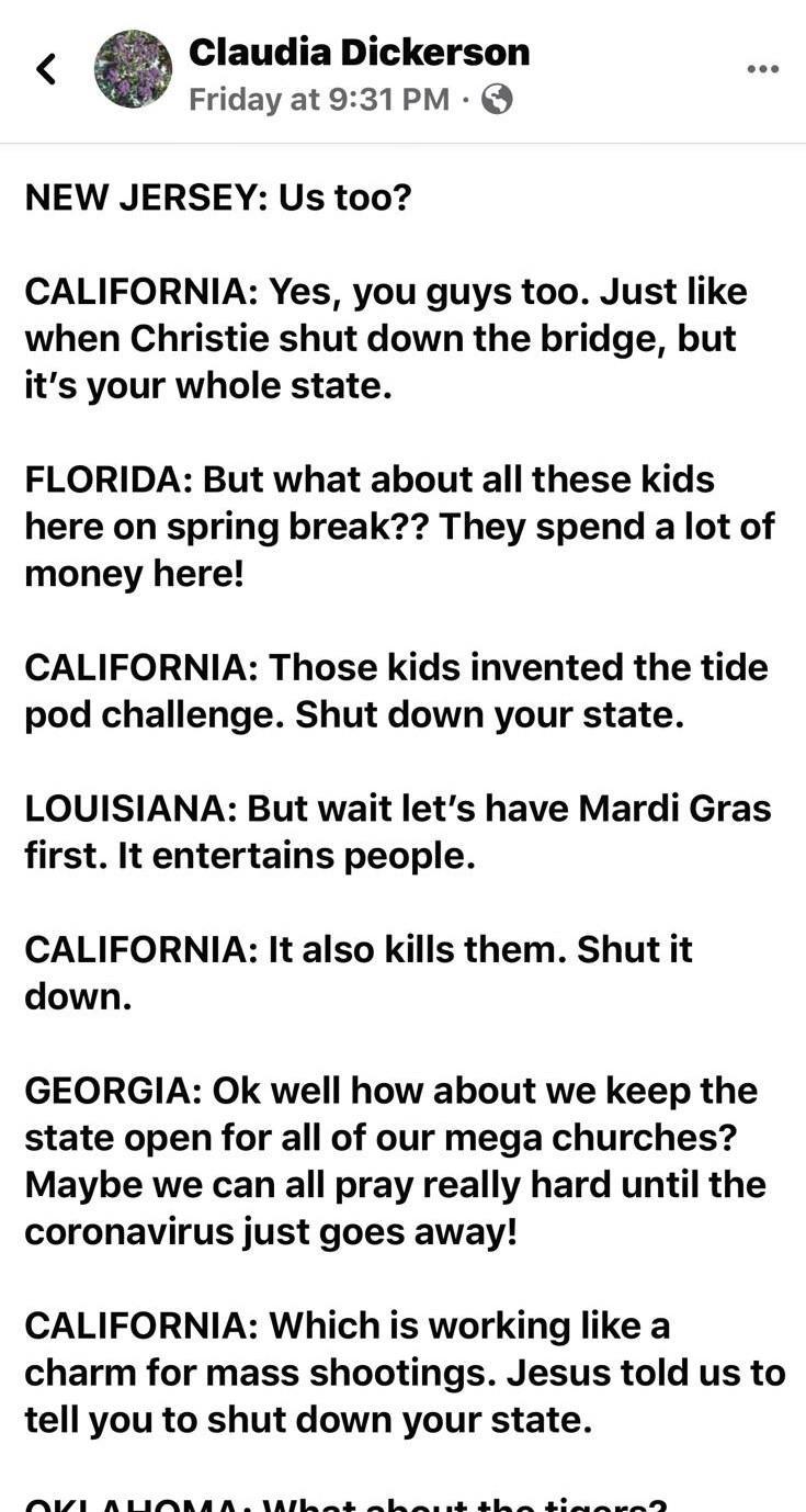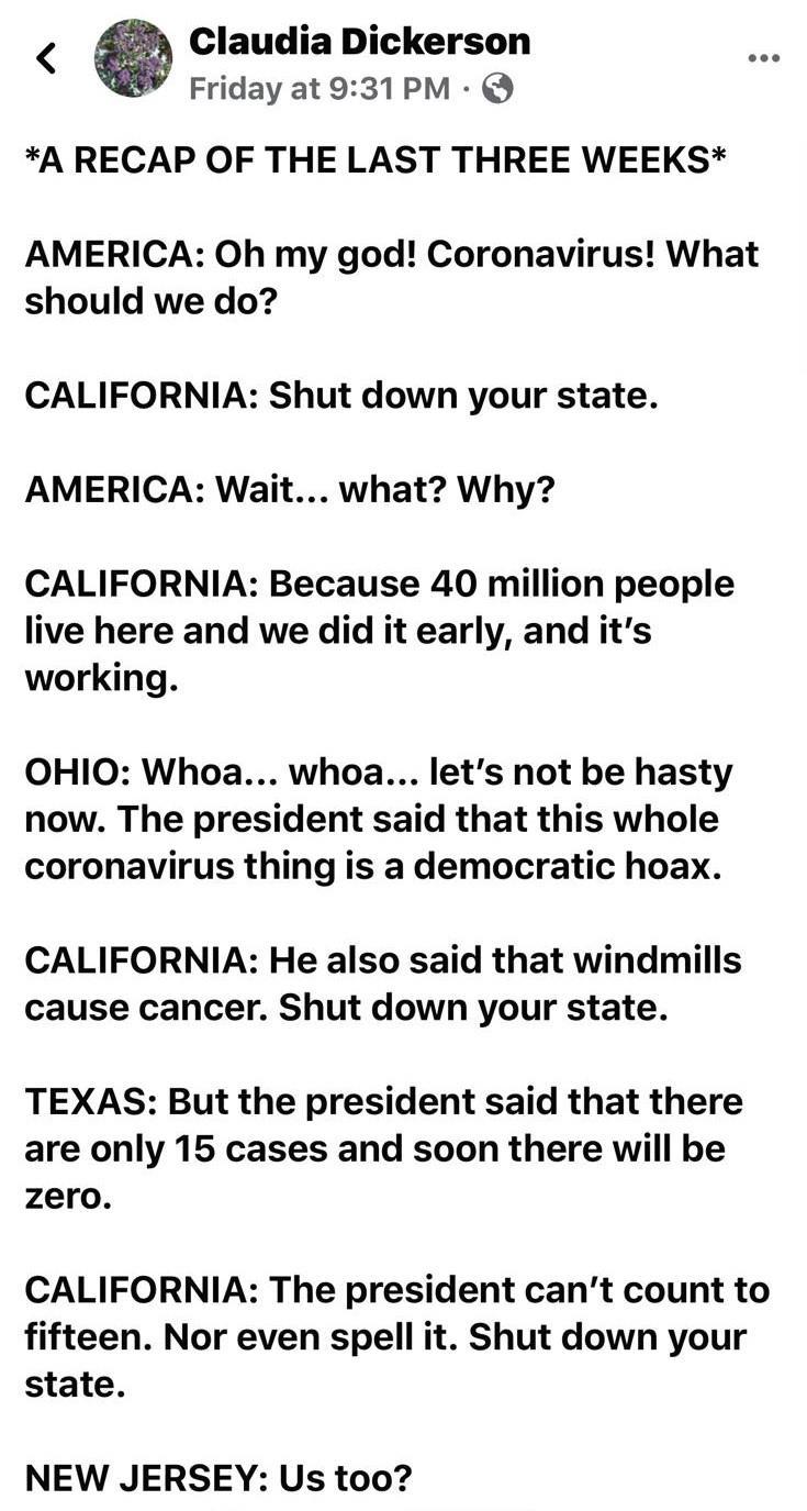 Автор: Данияр СугралиновПо американскому WhatsApp’у ходят скриншоты FB-поста Клаудии Дикерсон о том, что происходило в США в связи с коронавирусом. Мне кажется, вам будет интересно ознакомиться с моим немного вольным переводом и пояснительными примечаниями.