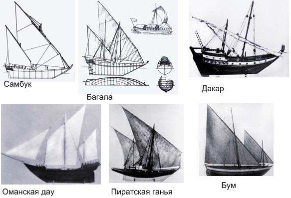 Пожалуй, самым популярным типом дау был самбук (самбука, санбук). И в наши дни самбук можно обнаружить у всех побережий Индийского океана. При длине свыше двадцати метров и ширине около пяти, водоизмещение самбука достигает восьмидесяти тонн, а грузоподъемность — пятидесяти. Острые обводы и низко сидящий корпус делают самбук одним из самых быстроходных судов этого класса, способным развивать скорость до одиннадцати узлов. Грот-мачта и бизань имеют наклон вперед (около 10◦) и несут на своих скошенных реях треугольные паруса. Позднее такие паруса назовут латинскими.