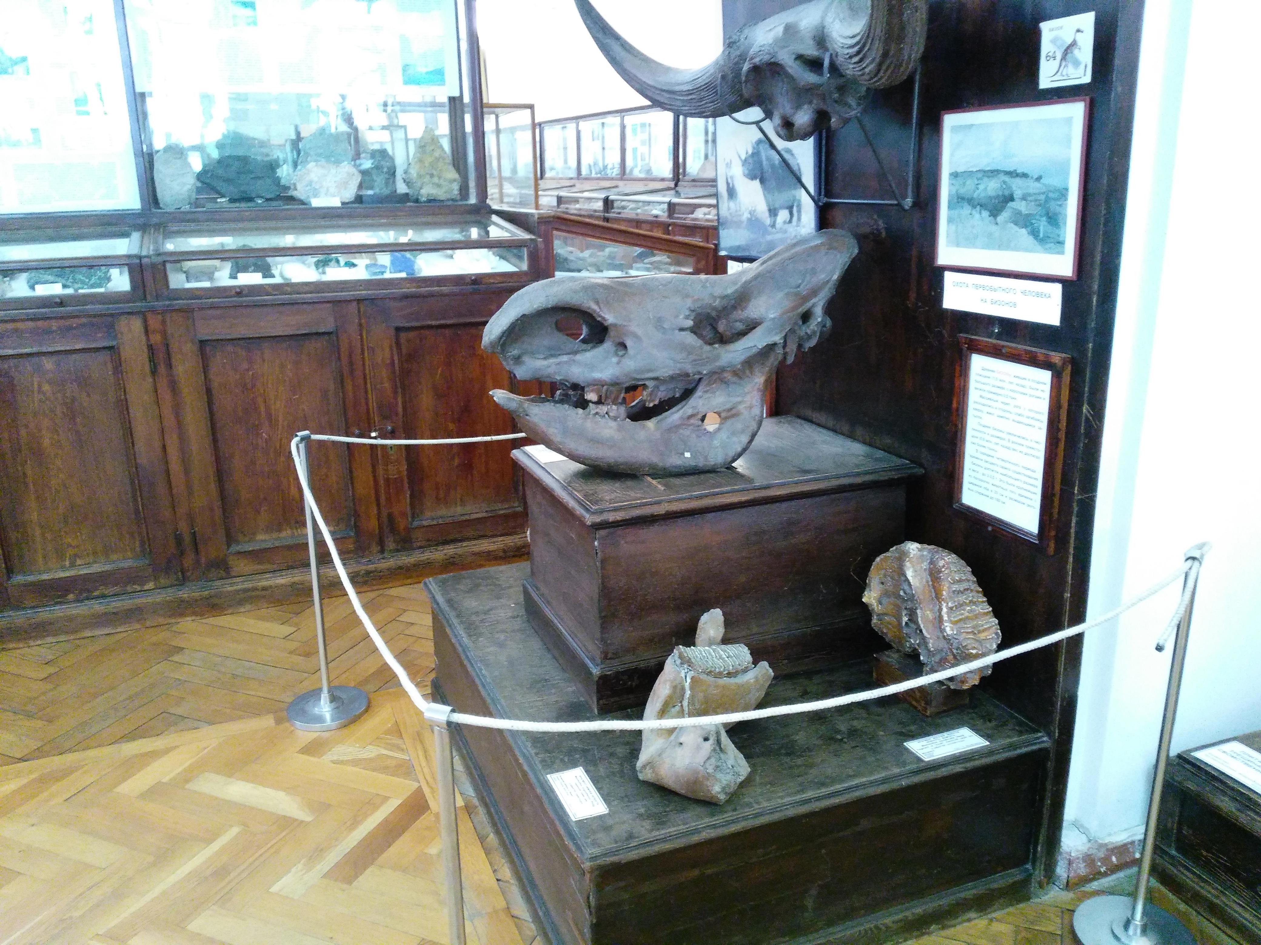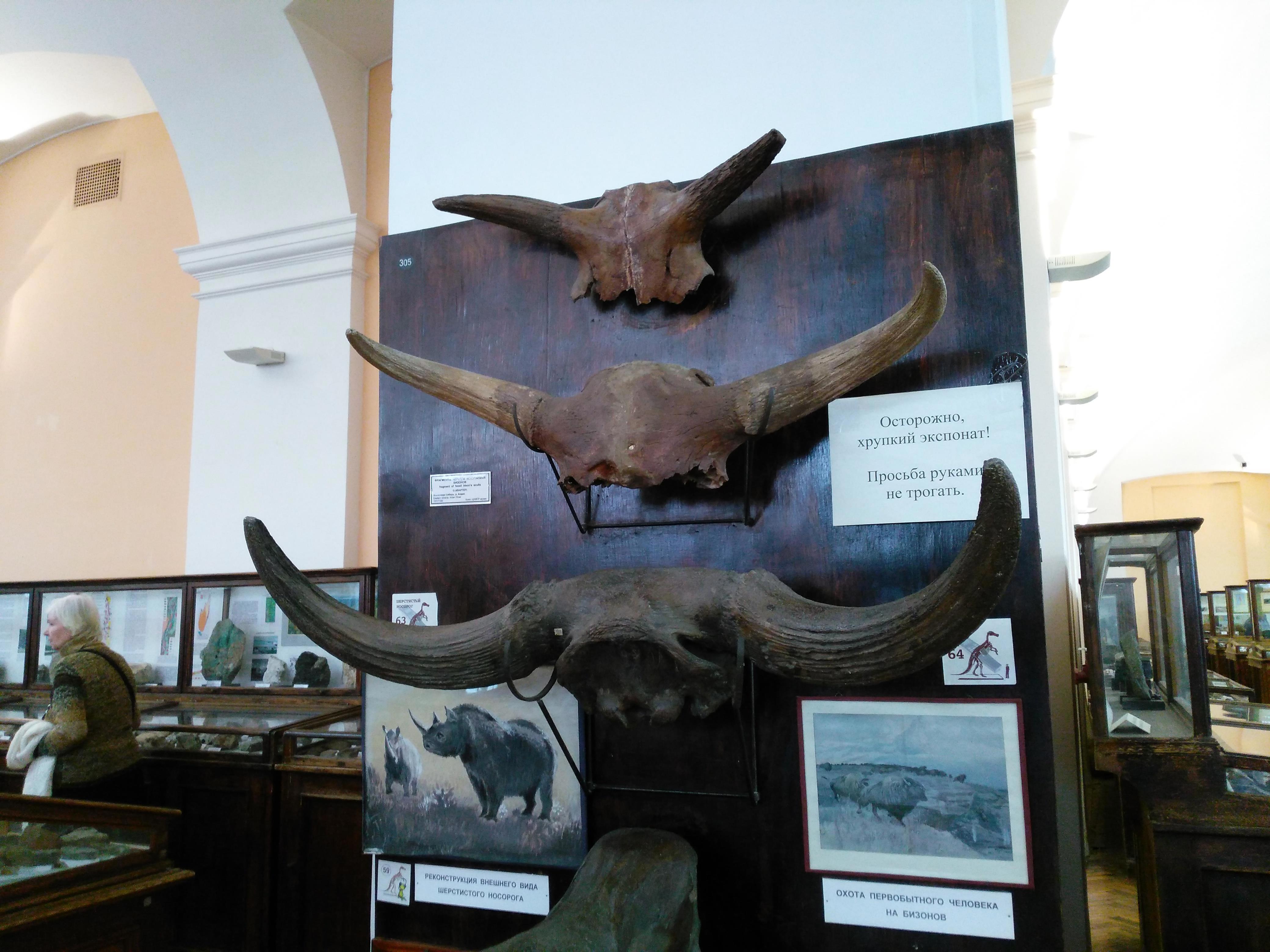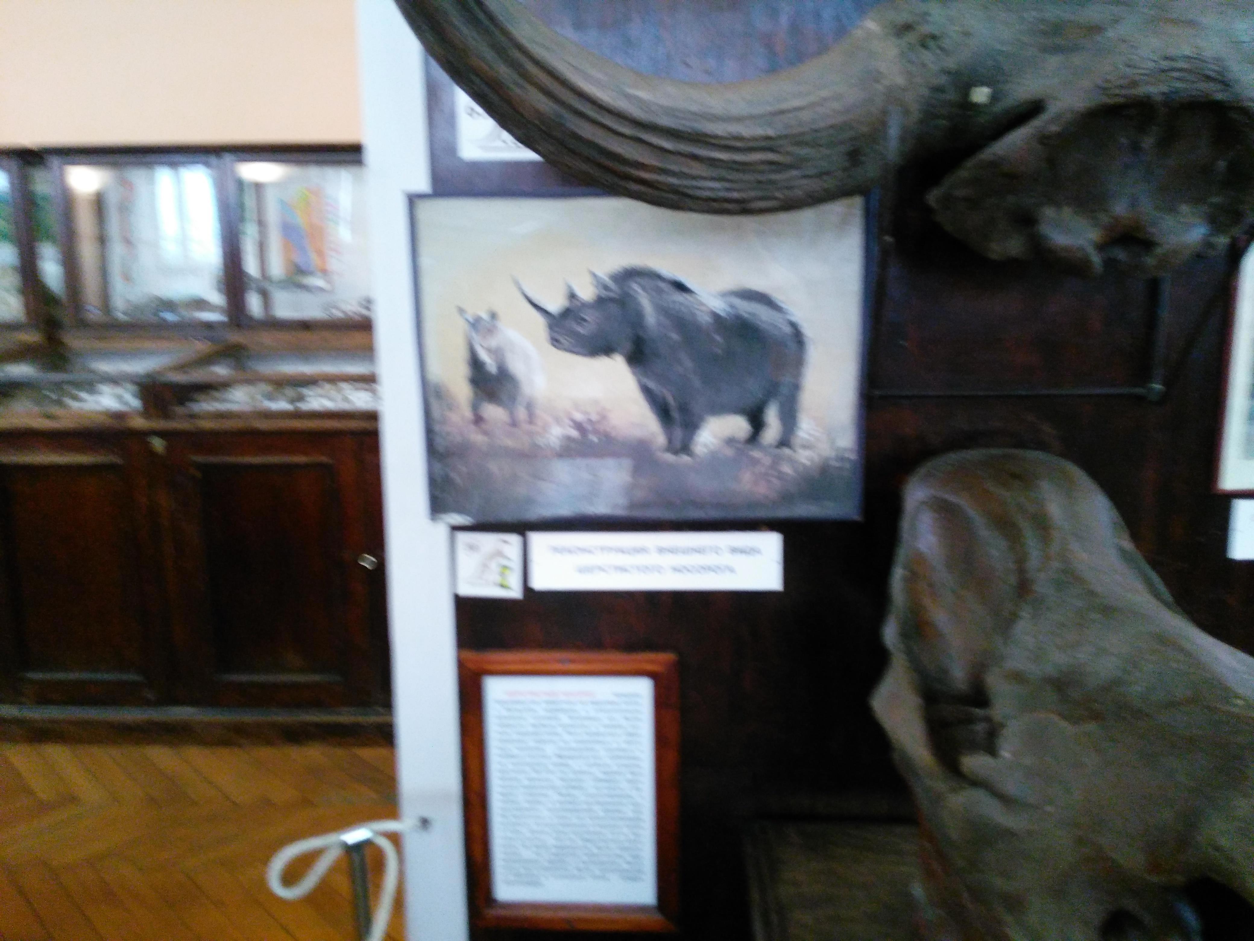 Стали смотреть фото. Там скелеты нашлись но от носорога один череп на экспозиции оказался. но и впрямь - с рогами!
