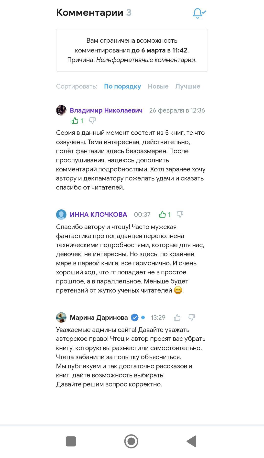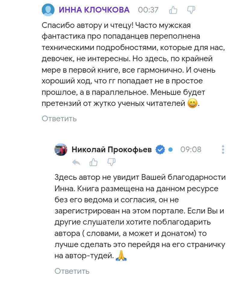Ближе к делу: я сотрудничаю с писателей Эдуардом Теном, озвучиваю его книги, и вчера зайдя на небезызвестный многим сайт книга-в-ухе, я неожиданно обнаружил их там в свободном доступе. Решив, что попали они туда по недосмотру, и сейчас администрация во всем разберется, я написал письмо администратору сайта, с просьбой убрать из доступа файлы нарушающие авторские права. Письмо мое было проигнорировано. Тогда (сутки спустя) мною был оставлен корректный комментарий под одной из книг, объясняющий слушателям, что автор не увидит здесь их благодарностей так как книги размещены без его ведома. Мой комментарий был удален, а возможность далее что то писать там мне лично была заблокирована на неделю. Точно так же произошло и с другим комментатором, написавшим не нарушающий никаких прав комментарий. Чтобы не быть голословным, прилагаю скрины комментариев. Вот такая история. Морали не будет. Совета не прошу. Как собака, все понимаю, но не могу ничего сказать. На сайте книг-в-ухе мною было размещено более ста моих работ (все с соблюдением авторских прав). Естественно больше я этого делать не буду. Всем спасибо за внимание. Вот такая фигня, малята...