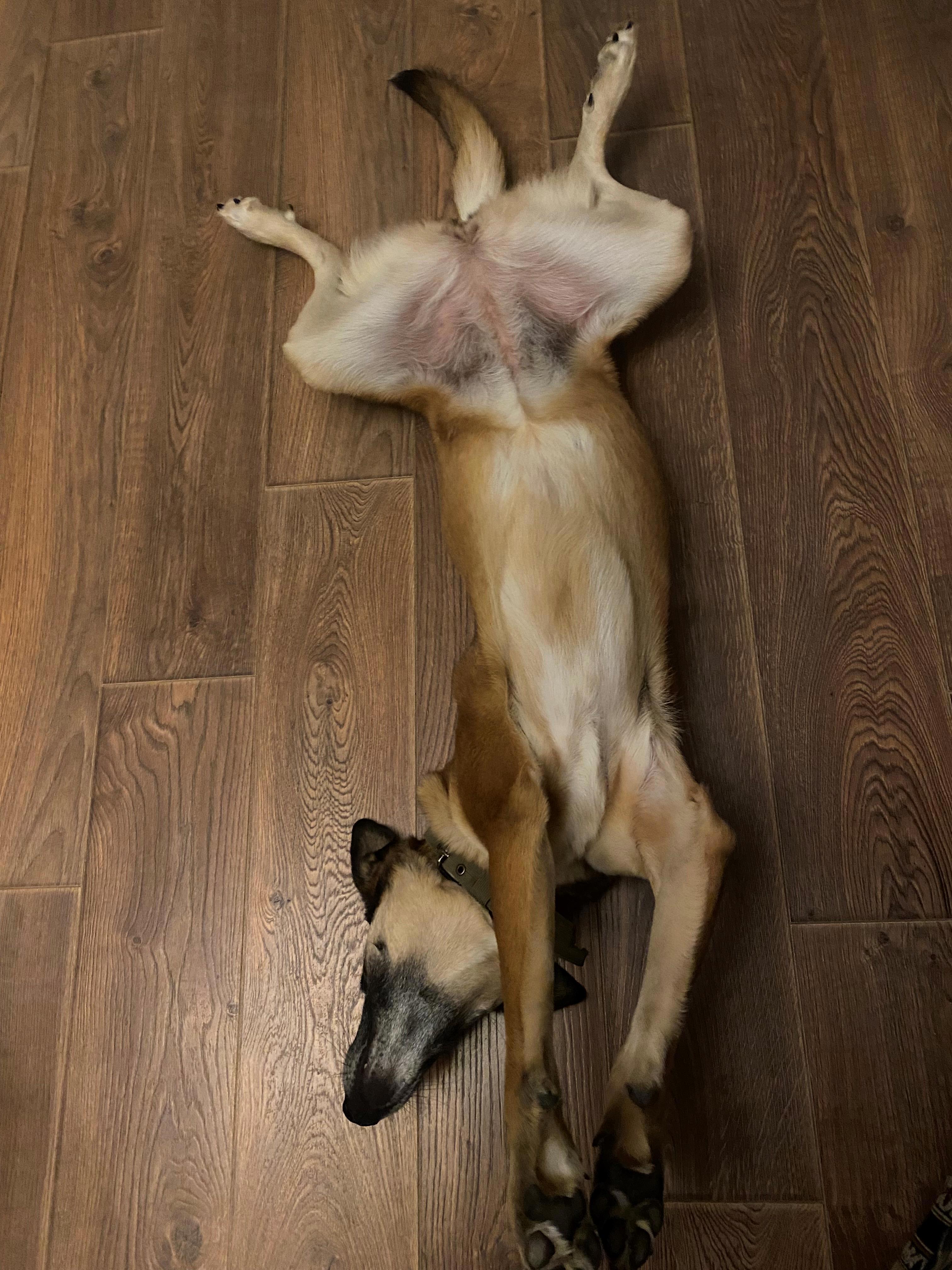 Что изображает собака после того, как обнаружила вкусное содержимое мусорного ведра.