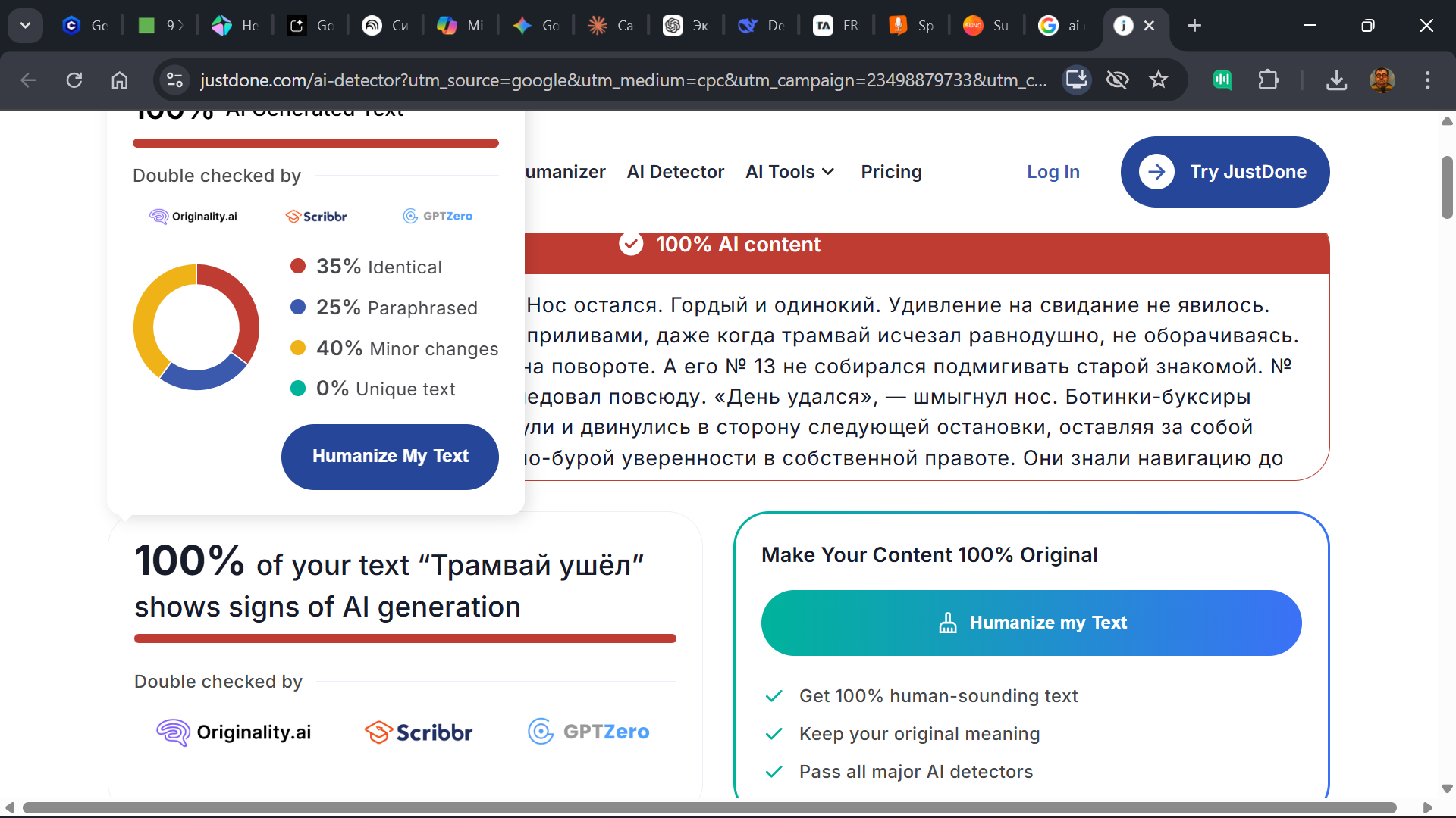А то, что JustDone тебе ещё и кнопку «Humanize My Text» подсовывает — это вообще шедевр. Сначала обвиняем, потом продаём индульгенцию. Бизнес-модель уровня средневековой церкви.