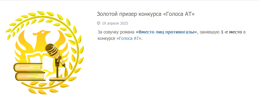 Александр: Хах, не понимаю, с чего бы у меня взялась «звёздная болезнь»? И почему мне нужно разговаривать с людьми «через губу»? Да и откуда вы взяли эти «заслуги до луны и обратно»? Да тут большинство из заглянувших на подкаст, вопросят: «О чём вы? Кто это?». Нет, я просто работаю свою работу (да, я люблю простенькие каламбурчики), работаю много и плотно. И победа на том же конкурсе «Голоса АТ» стала для меня неожиданностью. Я, конечно, слукавлю, если скажу, что не думал, что попаду в финалисты, но вот чтобы победить… Я вообще, честно говоря, подзабыл про конкурс, после того как отправил на него заявку. А потом сидел, в один момент, работал работу, и получил сообщение от АТ, что, «поздравляем, вы победили». Я тогда знатно ох удивился, потому что, по правде, я сам не доволен той своей конкурсной озвучкой, ведь она была сделана «с листа» - это когда ты открываешь текст и сразу начитываешь его под запись. Но я вообще редко доволен своей озвучкой. Это мои личные загоны. А организаторы молодцы. Там был проделан просто титанический труд и хочется ещё сказать им спасибо (надеюсь, увидят