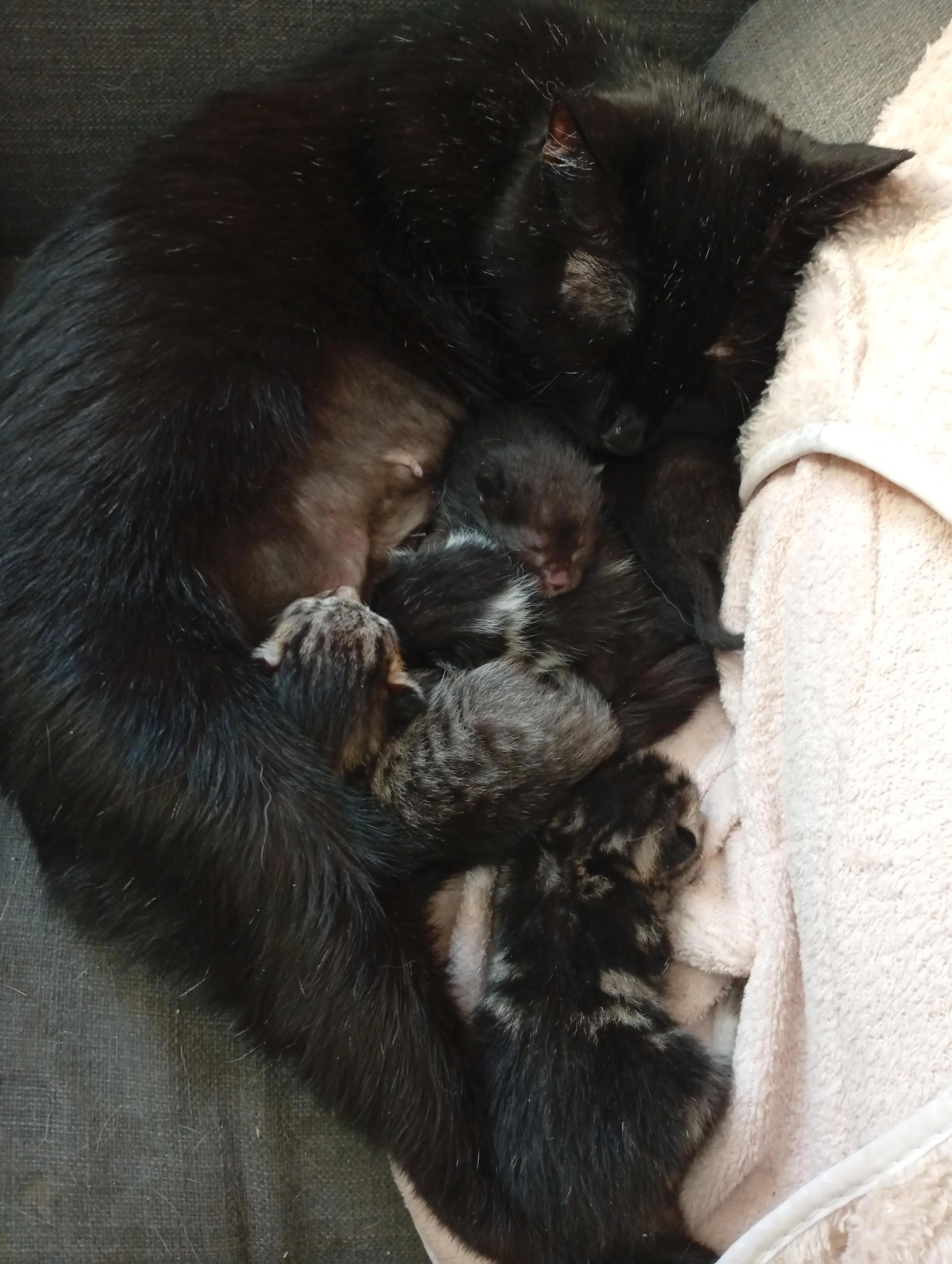 Ну да, в коробке 5 пищащих котят, ещё даже глаза не открылись. Немедленно увезли домой, конечно. Желаю мразям, которые оставили их в лесу, сдохнуть в мучениях. А котят как родных приняла одна из наших кошек. Теперь бы выкормить их нормально...