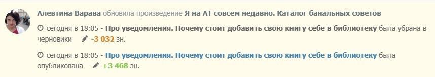 - про то, что символов в конкретной главе стало больше или меньше на цифру, превышающую пять тысяч для романов и повестей и три сотни для рассказов (отдельных или внутри сборника). То есть, если вы чуть-чуть подправите в объёмной работе – ничего. Но если вы чикнете или добавите много текста, будет уведомление;