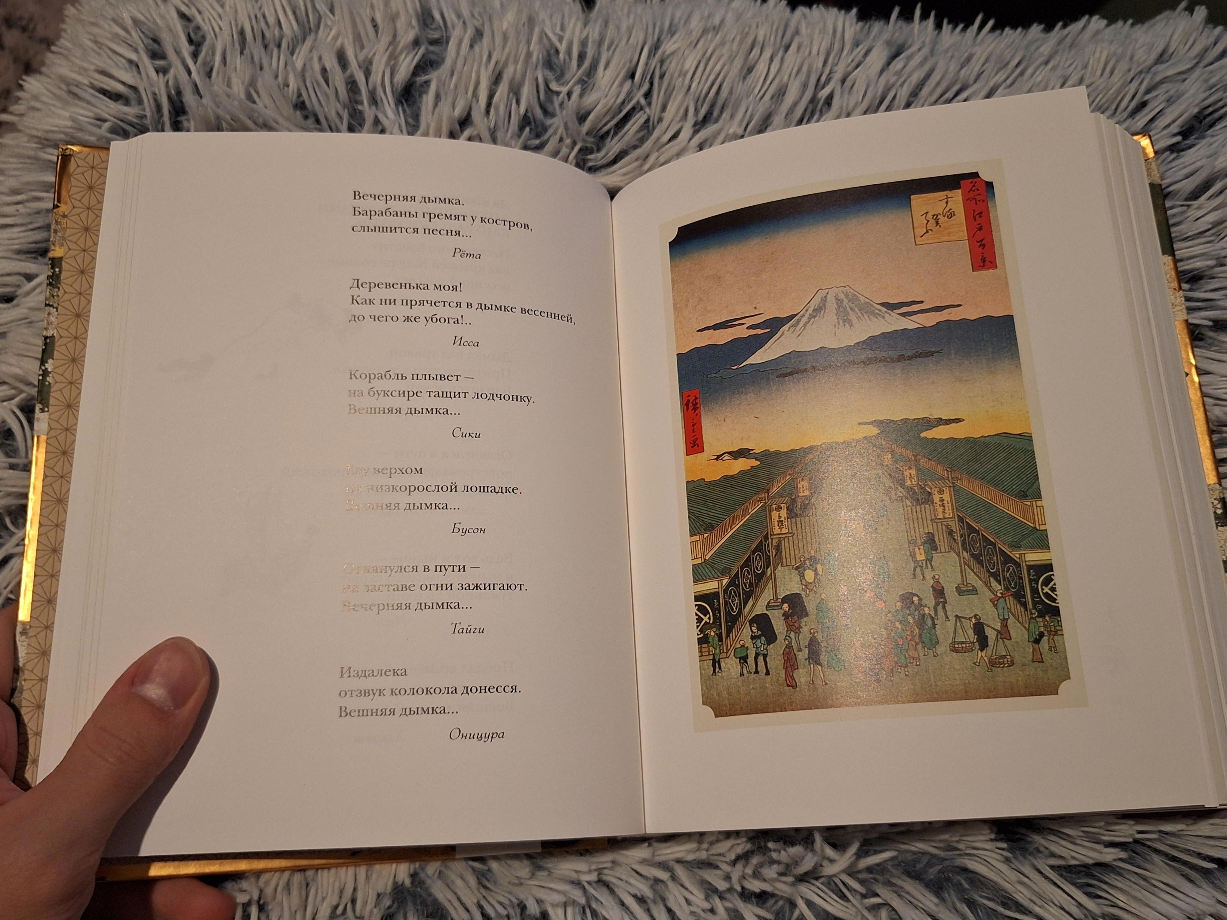 Книга от того же издательства «Азбука», всё те же хайку(только они), всё в том же переводе Александра Долина. Данная «книженция» довольно элитная среди остальных – имеет качественные страницы, цветные иллюстрации практически каждые две страницы, в оформлении использованы многочисленные гравюры и рисунки средневековых японских авторов, а также картины известного современного мастера японской живописи в стиле суми-э Олега Усова. Сборник дополнен каллиграфическими работами Станислава Усова. Сама книга за своё хорошее качество стоит около 3000 рублей(для кого-то это может стать минусом). Книга охватывает первые два сезона в году – весну и лето(есть вторая книга про осень и зиму). Книга для домашнего хранения, ибо из-за страниц весит очень прилично. Подарили мне её в этом году, буквально месяц назад, и я пока не успел её почитать, но надеюсь, что скоро до неё доберусь.