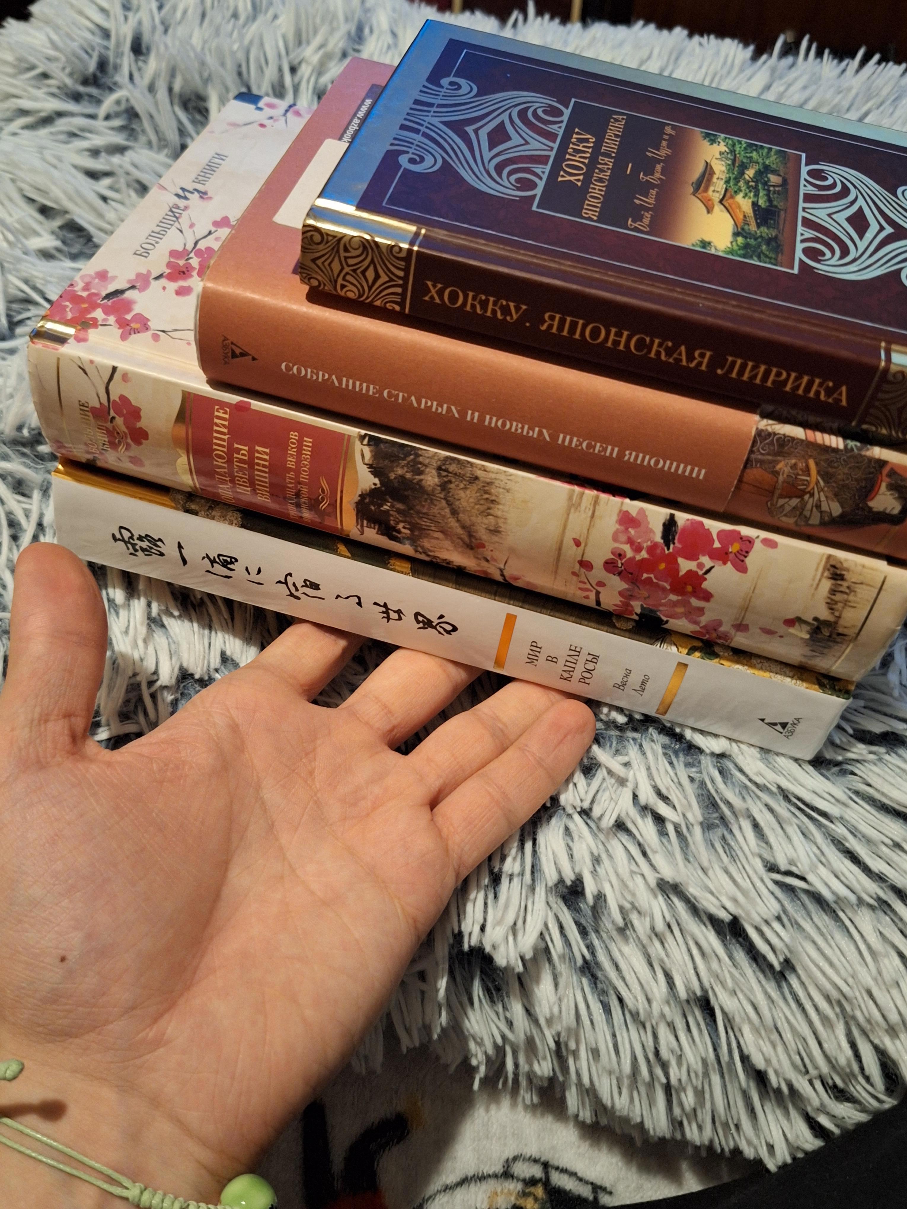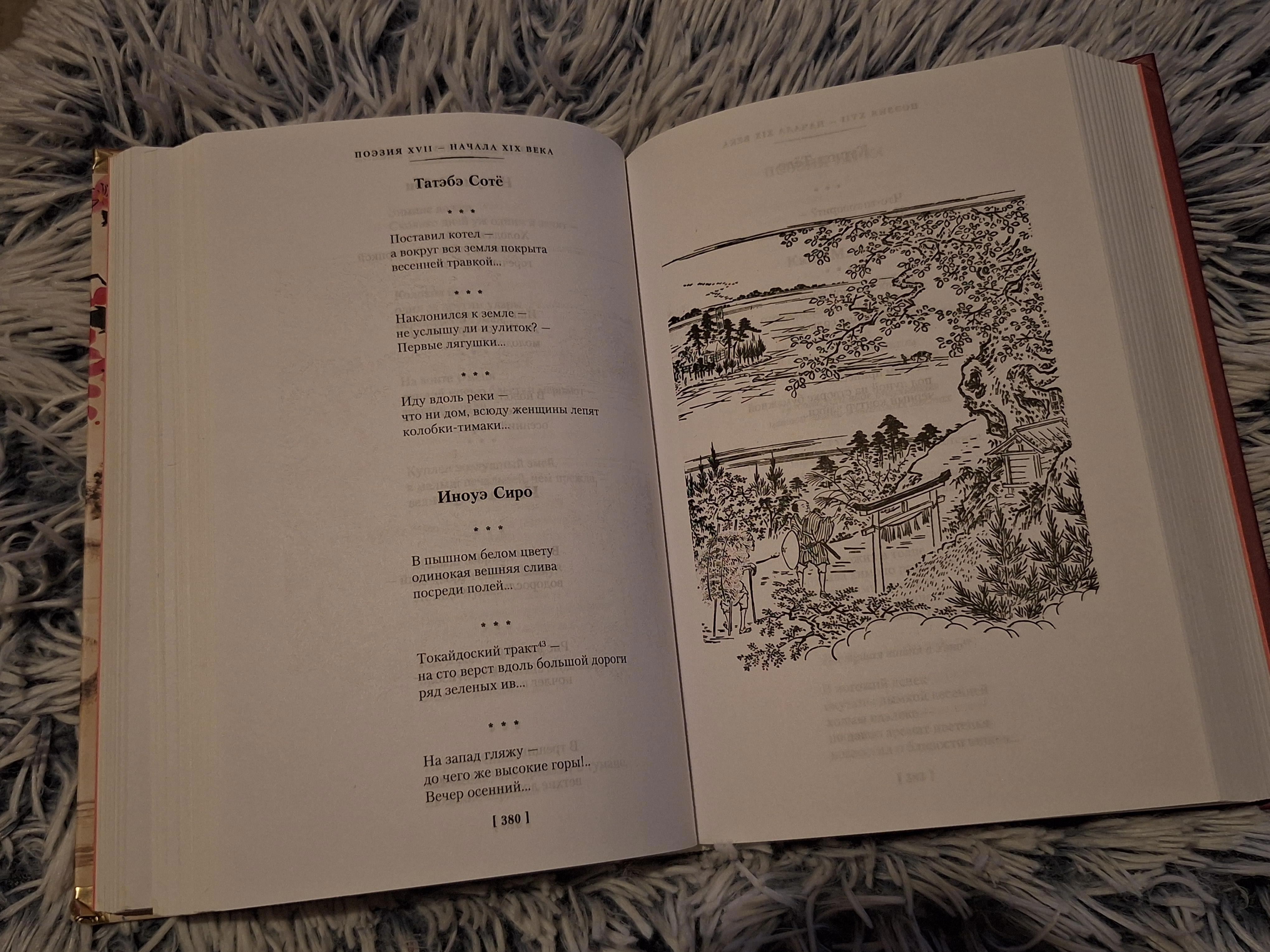 Книга от издательства «Азбука», стоит около 1200 рублей и была выпущена в 2023 году (я точно не уверен). Эта поэтическая антология уже намного больше предыдущей, она затрагивает все эпохи японской поэзии: от древних песен тёка до современных футуристов. Здесь представлены и танка, и рэнга, и хайку, и другие жанры Японии. Из плюсов: красивое оформление в виде чёрно-белых картинок(не густо, но хотя бы что-то) и большие статьи перед каждой эпохой, которые разъясняют, как менялось время в Японии, а вместе с ним и формы поэзии. Все стихи даны в переводе Александра Долина(как и во всех следующих книгах), также для каждого автора есть какая-никакая краткая биография – кто он такой и чем занимался. Из минусов: это большая «книженция», хоть и довольно лёгкая, так что читать её где-то вне дома будет сложновато, хотя у меня получалось. Купил я эту книгу тоже примерно год назад.