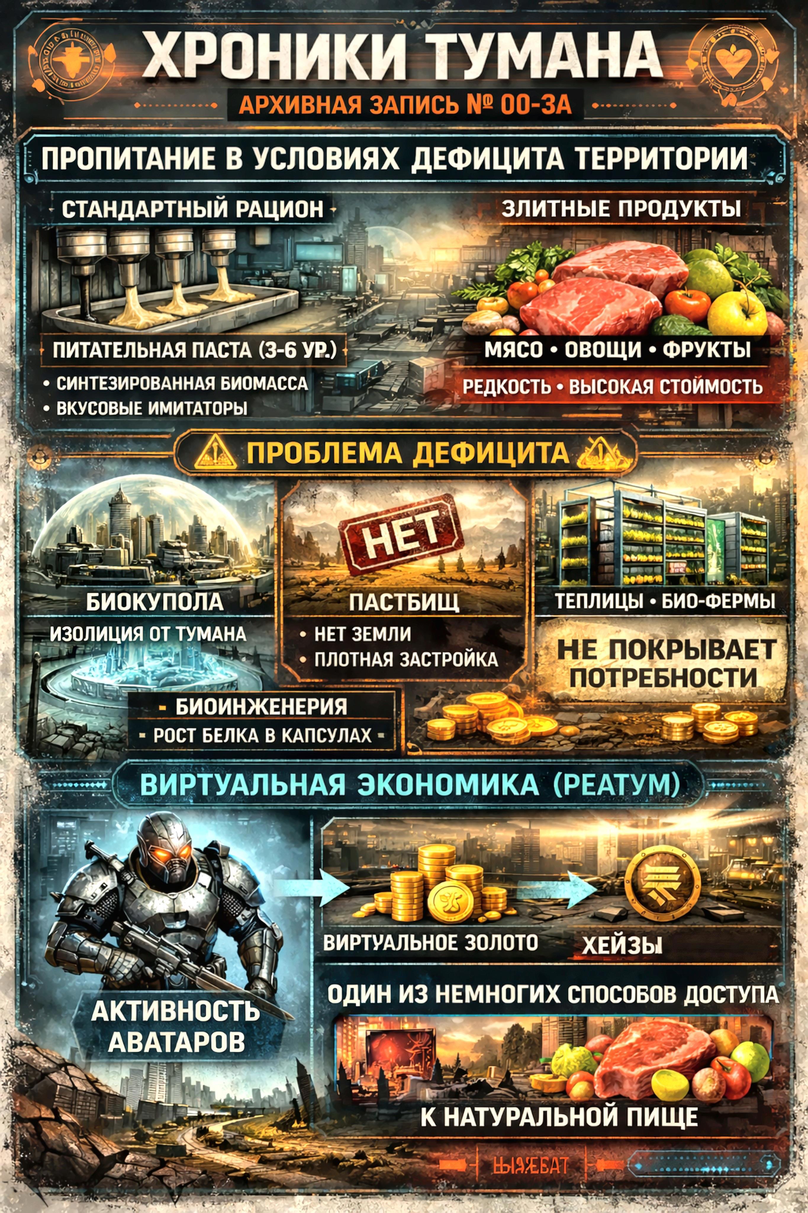 Критический дефицит натуральной продовольственной базы обусловлен изоляцией человечества под защитными биокуполами, отделяющими городскую среду от агрессивного Тумана. Ограниченная площадь внутри периметра делает невозможным ведение традиционного сельского хозяйства. Производство молочной продукции, например, осложнено отсутствием пастбищных территорий: биомасса травы, необходимая для естественного откорма скота, требует площадей, недоступных в условиях плотной модульной застройки. Существующие аграрные мощности (теплицы, био-фермы) не способны покрыть потребности населения, вынуждая администрацию сохранять синтетический рацион как основной.