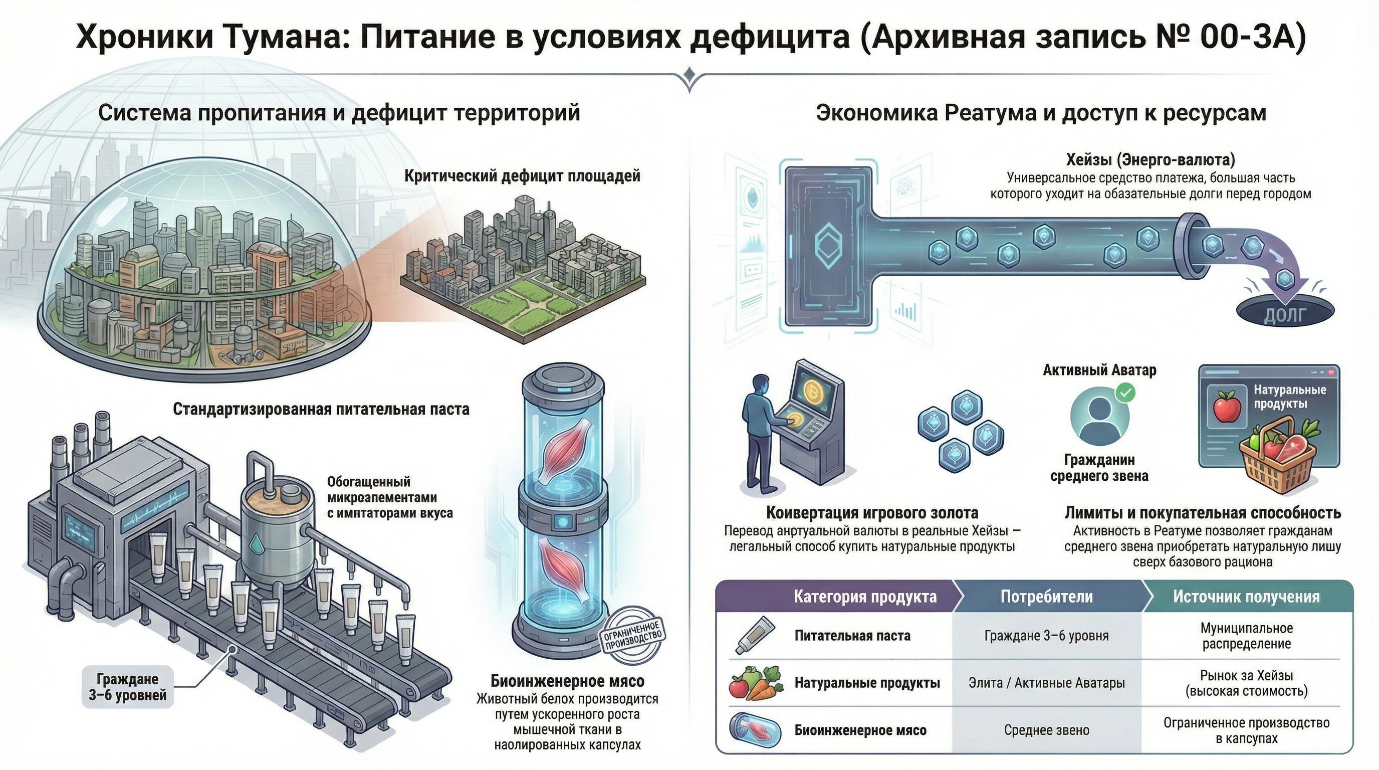 Для компенсации дефицита животного белка в физической реальности применяются технологии биоинженерии, такие как ускоренный рост мышечной ткани в изолированных капсулах, что минимизирует использование земельных ресурсов. Виртуальная среда Реатума в данном контексте выступает исключительно как экономический инструмент. Активность Аватаров и последующая конвертация добытого виртуального золота в реальную энерго-валюту (Хейзы) в рамках установленных лимитов является основным и одним из немногих легальных способов для граждан повысить свою покупательскую способность и получить доступ к натуральным продуктам питания сверх базового обеспечения.