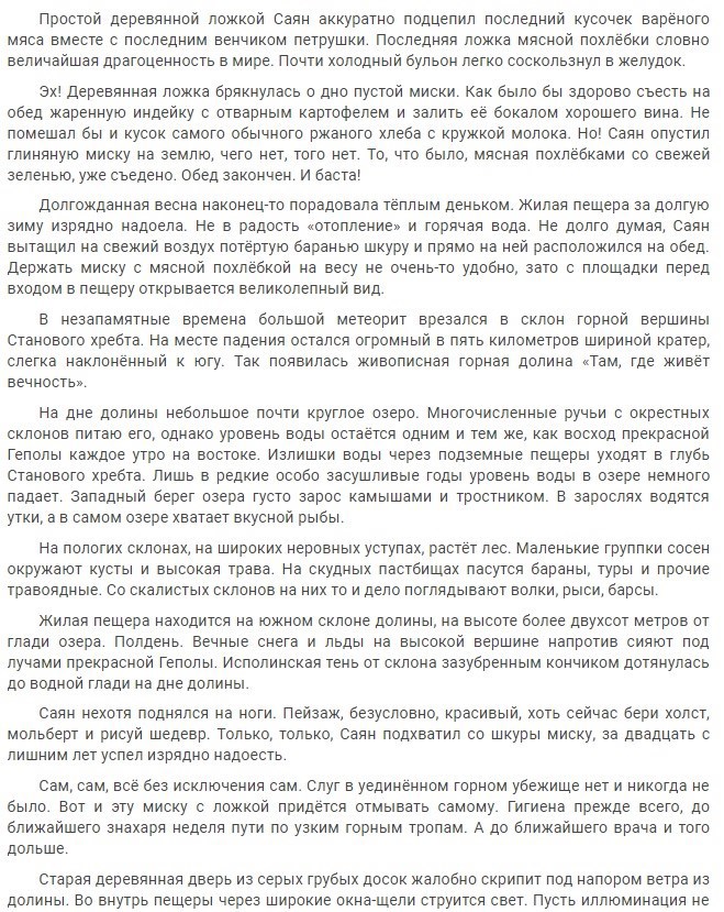 Третий абзац: Саян вроде бы в первом абзаце уже доел свою похлёбку... а здесь снова решил пообедать ею же? Кто за добавком, становись по правую сторону!