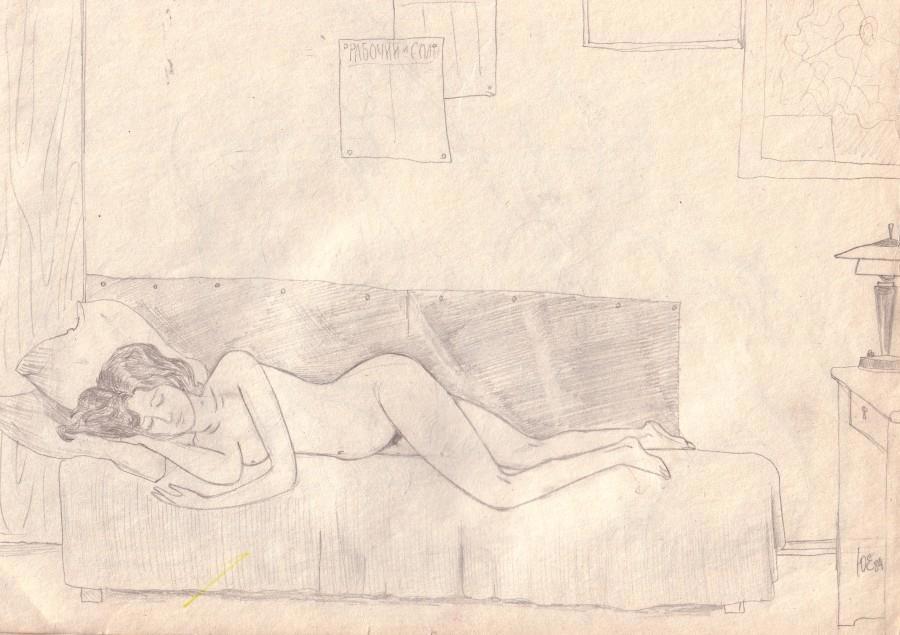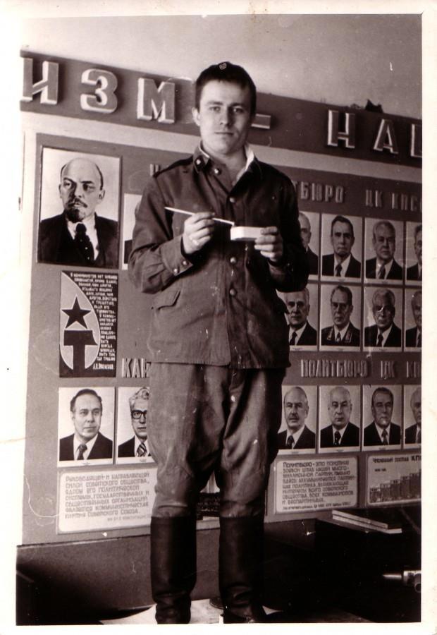 В мои обязанности входило поддерживать в должном состоянии наглядную агитацию: «Навстречу ХХ-какому-то съезду КПСС», приклеивать фото передовиков на стенд и так далее. Но в середине зимы мне пришлось готовить траурный стенд. Умер очередной генеральный секретарь коммунистической партии. Мне дали его портрет - из тех, что несли на демонстрациях. На уголок я прикрепил черную ленту. Все это мы водрузили на красную тумбочку и поставили перед портретом две гвоздики. Потом, когда траурные мероприятия закончились, портрет отдали мне в мастерскую. Я его утилизировал особым образом, разрисовал, и получилась абстрактная картина.