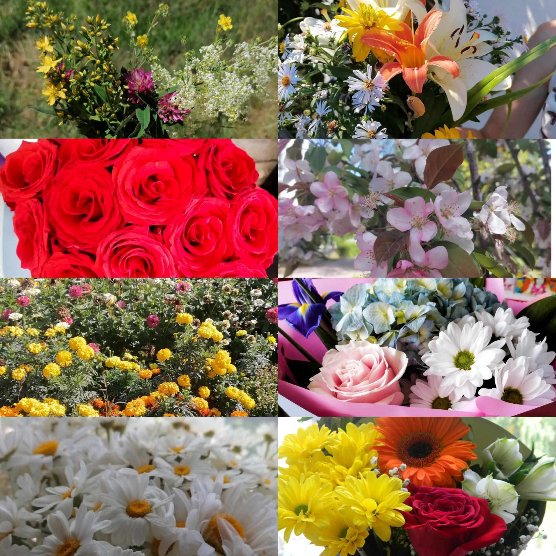 Бархатцы с моей дачи, лилии и ромашки оттуда же, подаренные разные букетики. На большом букете красных роз, я по-дурацки контрастность выкрутила, и они выглядят ненатурально, а оригинал мне лень искать. И просто полевые букеты – люблю всех всем сердцем.