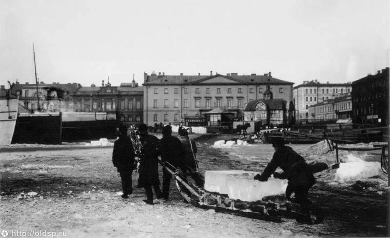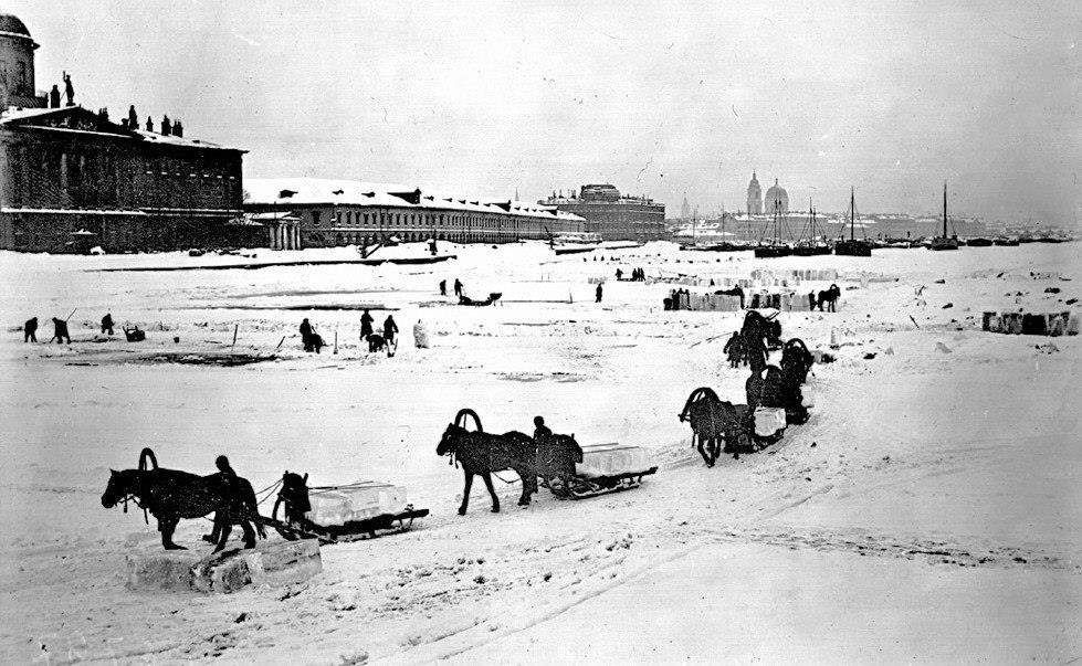 Одни усердно пилили, другие - вытаскивали гладкие глыбы из воды, третьи прямо тут - обтёсывали неровности превращая лёд в кубы или в параллелепипеды правильной формы, а четвёртые уже грузили ледяные куски на сани и тащили их по направлению к построенным ледникам.