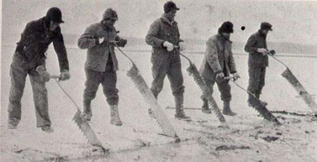 Зимой люди выходили на лёд рек, прорубали прорубь и опускали в неё кованные пилы с подвешенным грузом на другом конце и начинали пилить лёд.