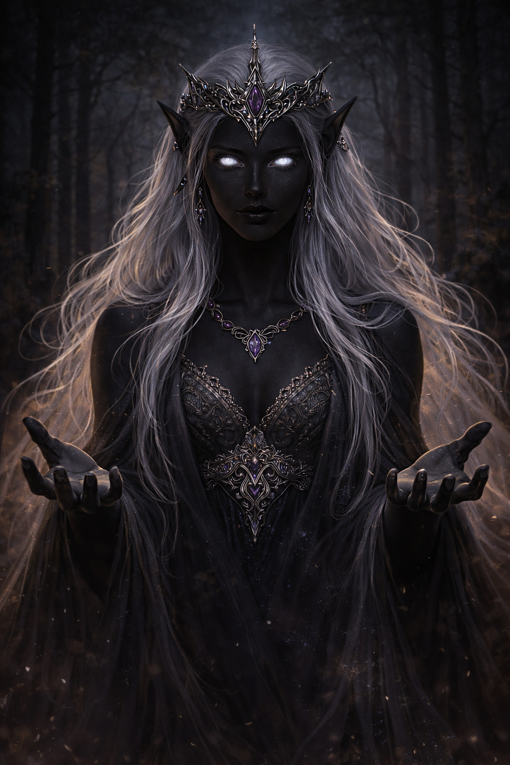 -Ты явился сюда, где являешься нежеланным гостем, и думаешь,что смеешь приказывать мне, что делать? - из-за деревьев выступила женщина, чарующая и опасная, как безлунная ночь. На ее антрацитово-черном лице глаза светились звездным светом и их взгляд невозможно было выдержать — так глубок и ужасен он был. Волосы, белоснежные, с серебряным отливом, волной спускали к земле, переплетаясь с лентами одеяния, просторного и обволакивающего женственную, чувственную фигуру, скрывающего и в тоже время — бесстыдно-подчеркивающего все изгибы.Свои руки, с тонкими, длинными пальцами и узкими запястьями она держала на виду, развернув ладонями вверх, демонстрируя мирный характер своих намерений, но я, каким-то звериным чутьем ощущала бездну опасности, которую таила в себе эта Темная.