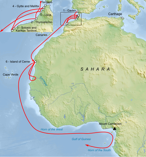 Но с другой стороны, найдены следы 7 колоний, основанных Ганноном (согласно периплу) на территории современного Марокко. Да и логика на стороне версии "карфагеняне туда плавали". Почему? Потому что именно с V века до н.э. Карфоаген начинает активно использовать в торговле африканское золото. А по морю добраться до него намного проще, чем через пустыню.