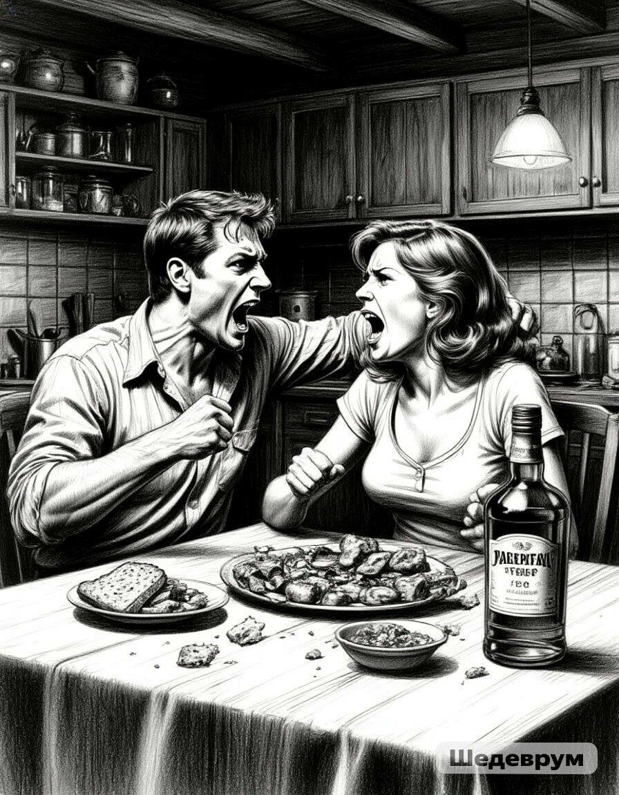 Хозяева, совершенно трезвые, сидели плечом к плечу и ждали, когда их силы иссякнут. Наконец, дебоширы утомились, обнялись и через пару минут дружно захрапели.
