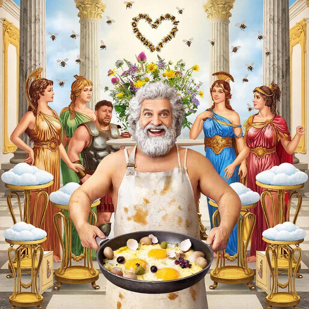 Из-за стола вышел Зевс. В фартуке, со сковородой. На сковороде лежало нечто со скорлупой, оливками и виноградом.