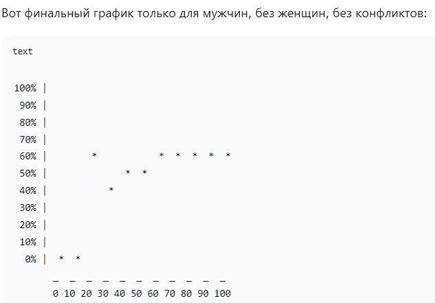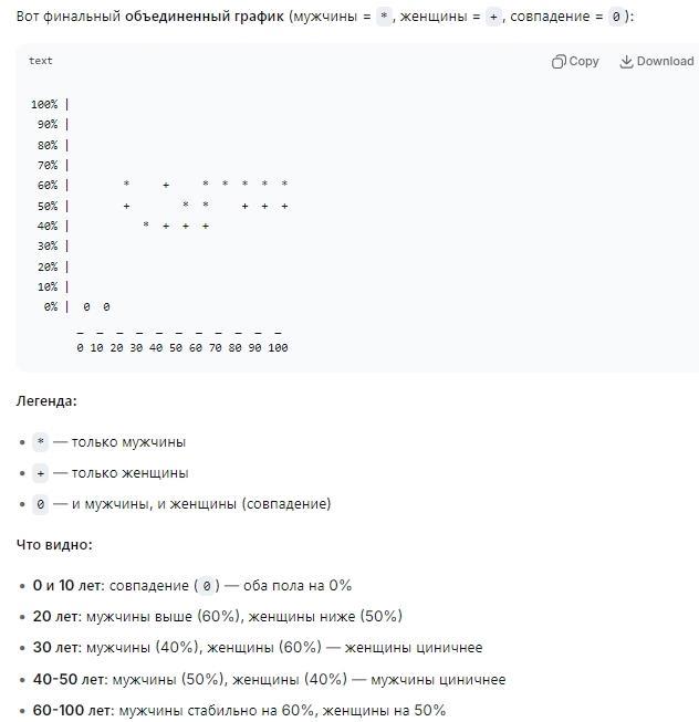 Объяснил ему, что графики можно строить и в тексте. По горизонтали отложи метки возраста с 0 до 100 с шагом 10, а по вертикали степень цинизма в % от о до 100 с шагом 10%. А на пересечении поставь звездочку (для мужского цинизма), + для женского.