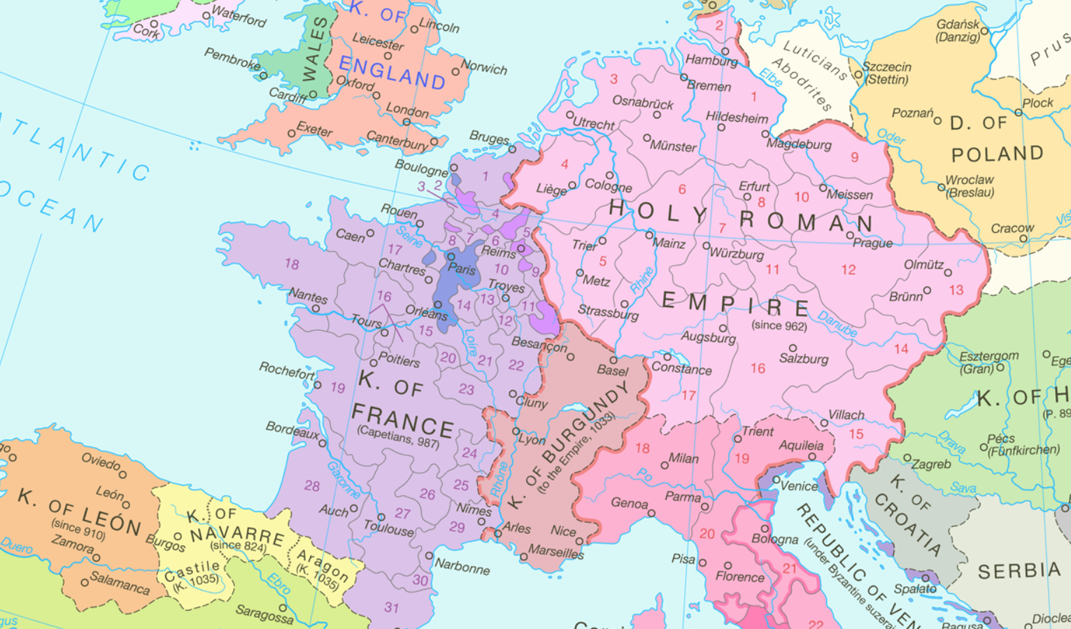 Тем не менее, новые короли и императоры обладали гораздо меньшей властью, чем предполагалось в их названии, поскольку они должны были терпеть или противостоять феодалам в своих царствах. Поэтому концепция страны в современном понимании этого слова почти не существовала. Настоящей властью в молодом королевстве Франции был не король, который был немногим больше, чем первый среди равных, а правители многочисленных герцогств и округов королевства, большинство из которых были больше и сильнее королевской королевской короны. На севере стратегическое положение и экономический потенциал графства Фландрия в конечном итоге вызовут головную боль у многих французских монархов, как и герцогство Нормандия; на востоке герцогство Бургундия придерживалось гордой традиции фактической независимости, которая полностью вышла из-под контроля; на юге и западе могущественное графство Тулуза и герцогства Гайен и Гасконь сыграли бы важную роль в феодальных попытках сохранить местную автономию, распространении религиозной ереси и династических механизмов, которые помогли развязать Столетнюю войну. Потомкам Хью Капета предстояло много работы, так как в средние века пришло в голову то, что должно было стать их королевством.
